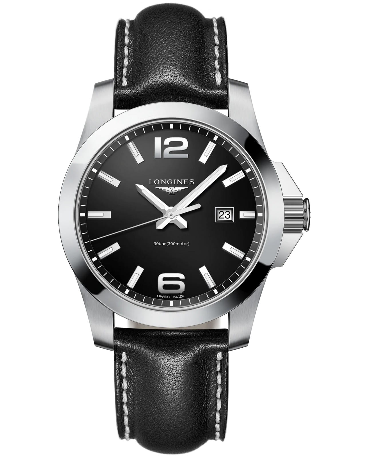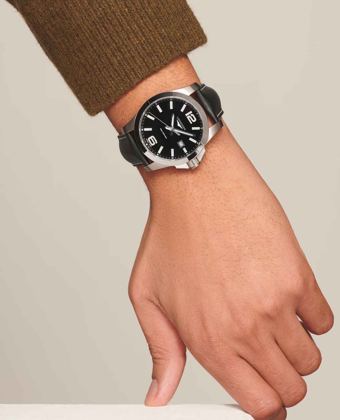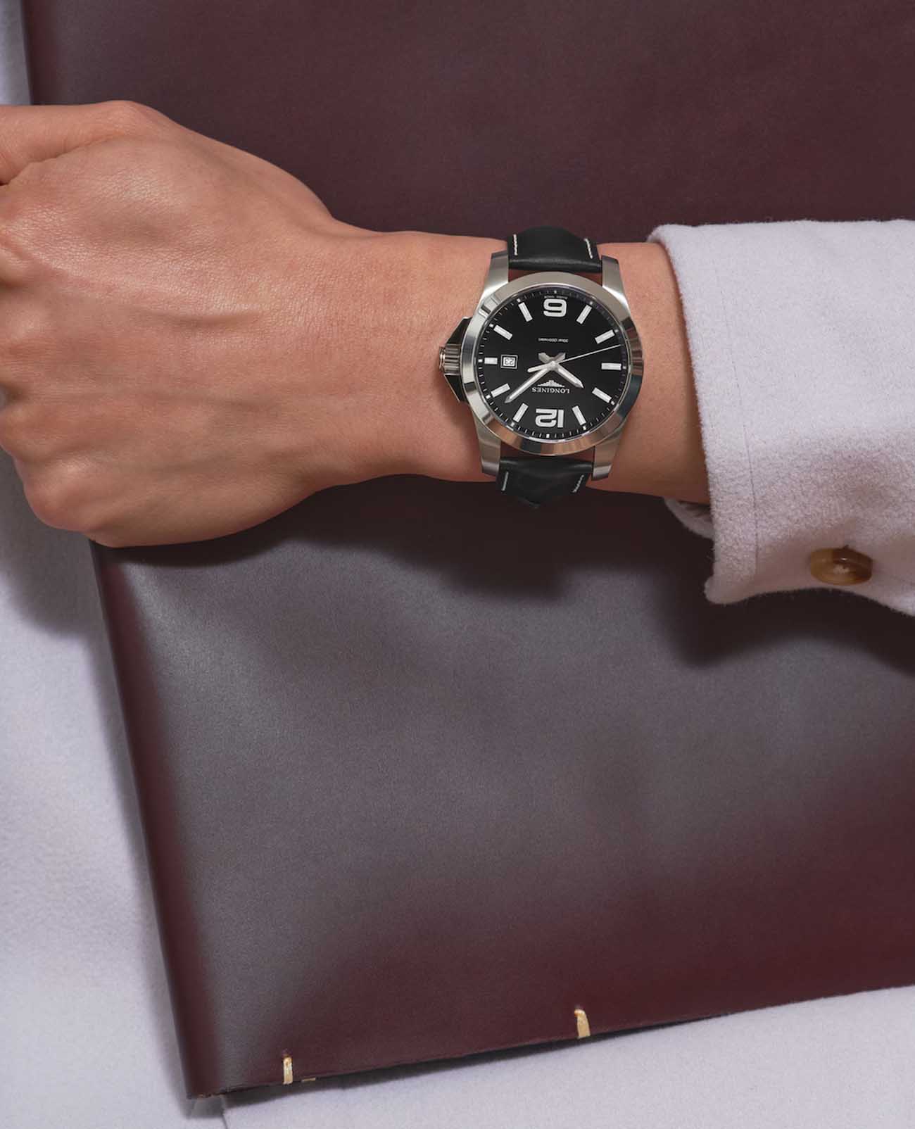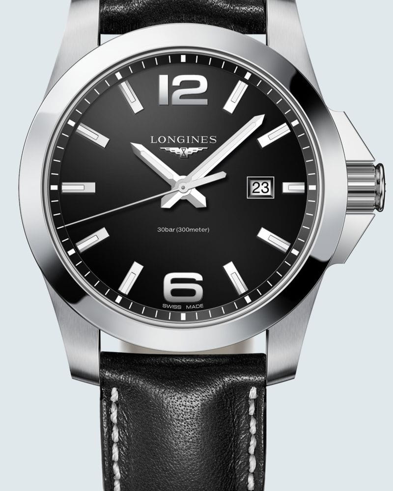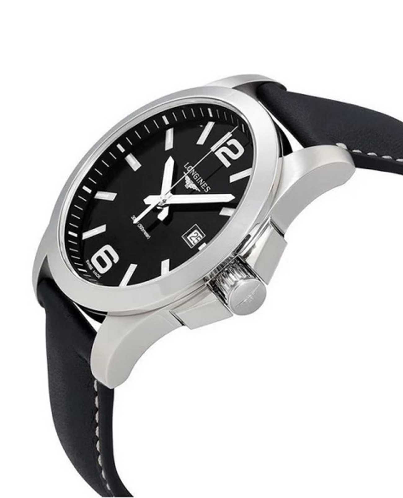 Часы Longines Conquest (артикул L37604563) сочетают спортивную элегантность и высокую функциональность, характерные для коллекции Conquest. Корпус диаметром 43 мм выполнен из нержавеющей стали с водозащитой до 30 бар (300 метров). Завинчивающаяся заводная головка и задняя крышка подчёркивают надёжность. Чёрный циферблат с солнечным узором оснащён накладными арабскими цифрами и индексами, стрелками с люминесцентным покрытиемЛюминесцентное покрытиеПозволяет считывать показания времени в темноте. Производители наносят на стрелки, часовые индексы, безель или поверхность циферблата светонакопительный состав, дающий холодное свечение., а также окошком даты в положении «3 часа». Циферблат защищён сапфировым стекломСапфировое стеклоПрочный и надёжный материал из кристалла сапфира синтетического происхождения, характеризующийся особой твёрдостью и устойчивостью к царапинам и повреждениям. с антибликовым покрытием.