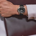 Ремешок из чёрной кожи с застёжкой бабочкойЗастёжка "бабочка"Такой вид застёжки дополняется предохранителями, помогающими избежать случайного раскрытия браслета. Обладают изящным исполнением. и механизмом открытия с кнопками обеспечивает комфортное и надёжное ношение.