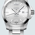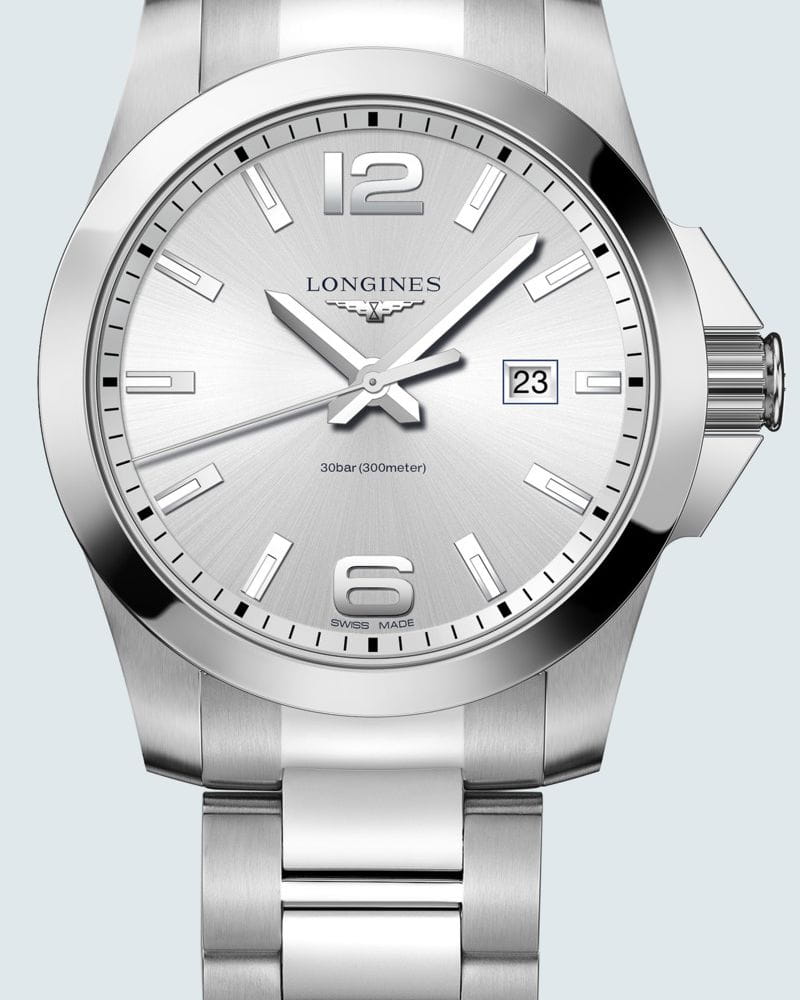 Часы Longines Conquest (артикул L3.760.4.76.6, также известный как L37604766) сочетают спортивную элегантность и высокую функциональность, характерные для коллекции Conquest. Корпус диаметром 43 мм выполнен из нержавеющей стали с водозащитой до 30 бар (300 метров). Завинчивающаяся заводная головка и задняя крышка подчёркивают надёжность. Серебристый циферблат с солнечным узором оснащён накладными арабскими цифрами и индексами, стрелками с люминесцентным покрытиемЛюминесцентное покрытиеПозволяет считывать показания времени в темноте. Производители наносят на стрелки, часовые индексы, безель или поверхность циферблата светонакопительный состав, дающий холодное свечение., а также окошком даты в положении «3 часа». Циферблат защищён сапфировым стекломСапфировое стеклоПрочный и надёжный материал из кристалла сапфира синтетического происхождения, характеризующийся особой твёрдостью и устойчивостью к царапинам и повреждениям. с антибликовым покрытием.