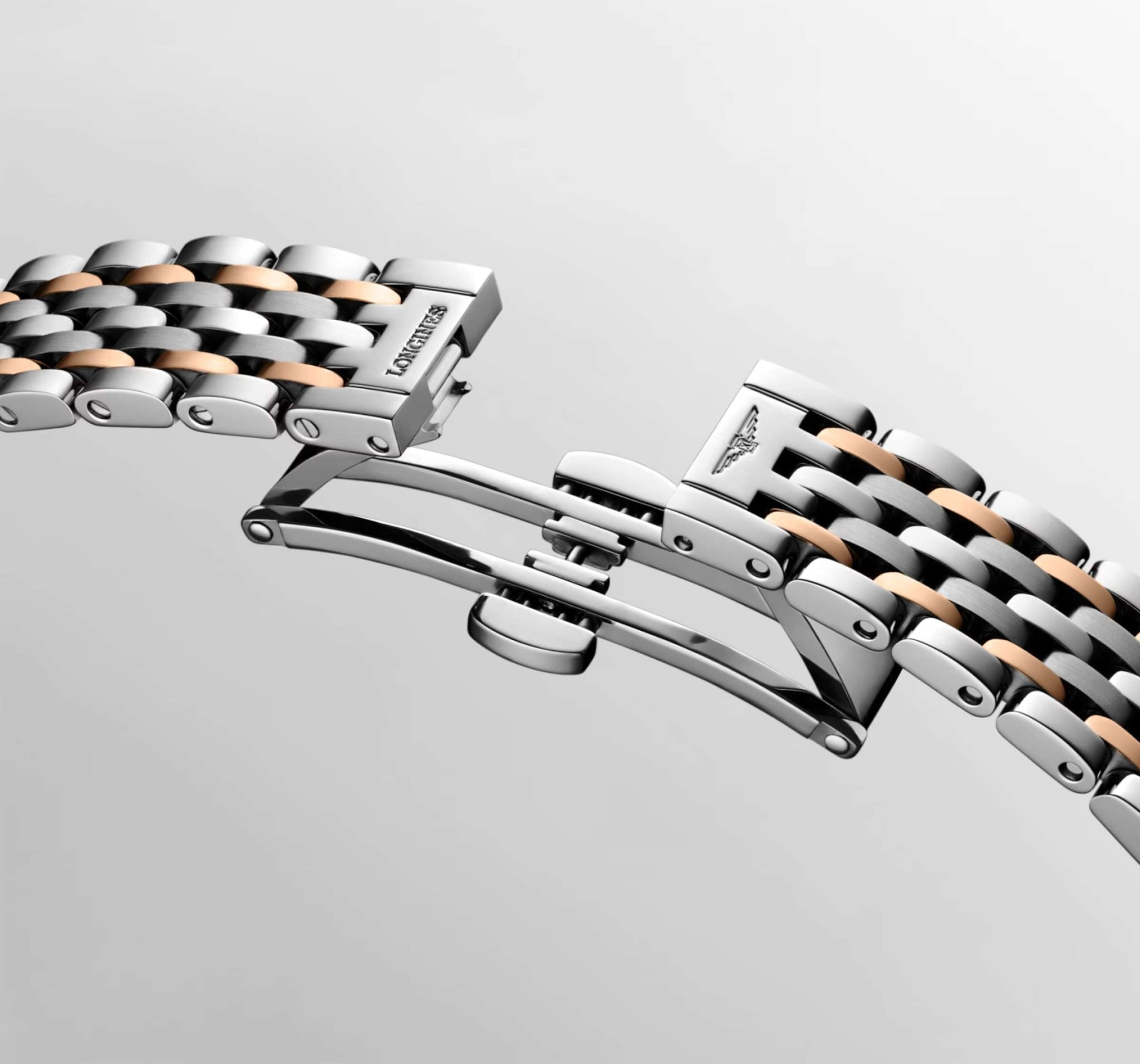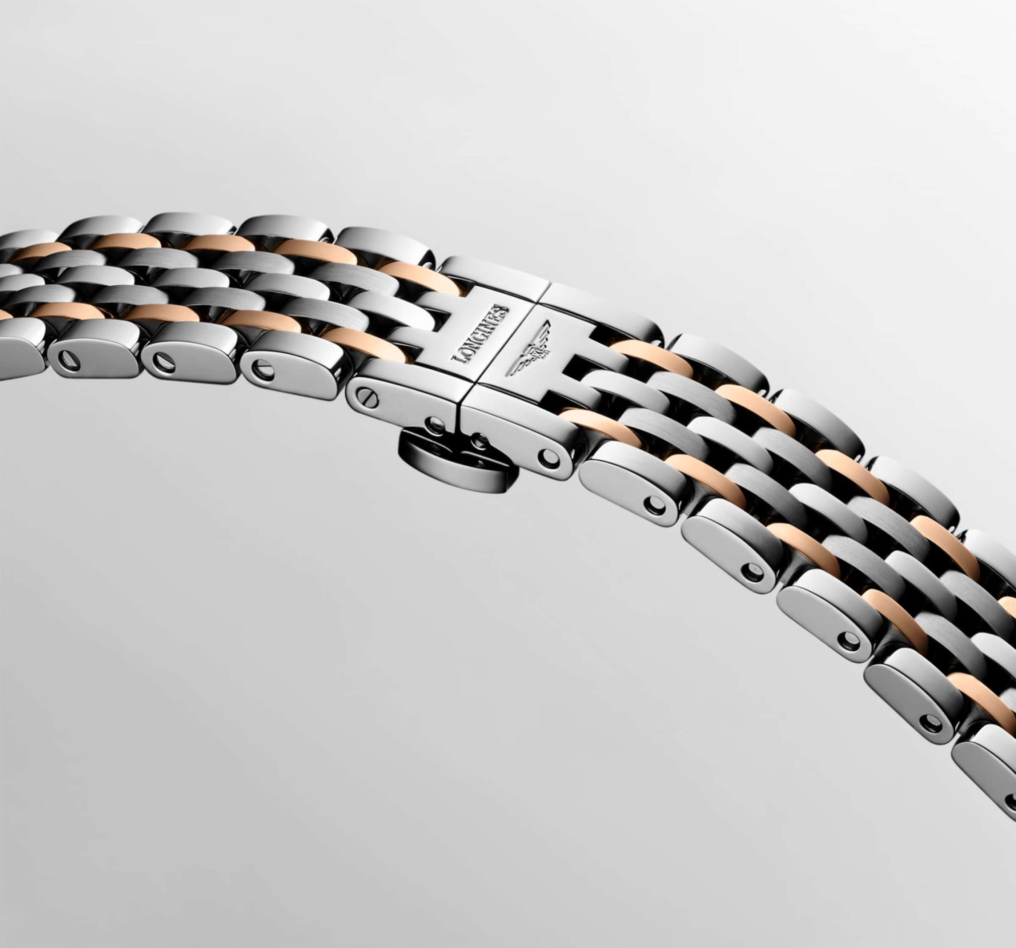 Изысканные женские часы Longines Elegant Collection L4.310.5.80.7 — это воплощение спокойной роскоши и вечного стиля. Все элементы циферблата подчеркивают элегантность и классический вкус модели. Корпус часов изготовлен из нержавеющей стали, диаметром 29 мм. Защиту циферблата обеспечивает прочное сапфировое стеклоСапфировое стеклоПрочный и надёжный материал из кристалла сапфира синтетического происхождения, характеризующийся особой твёрдостью и устойчивостью к царапинам и повреждениям. с антибликовым покрытиемАнтибликовое покрытиеСлой оксида металла в 0,13-0,3 микрон, благодаря которому стекло часов не бликует и не отражает свет. Антибликовое покрытие уменьшает отражение света в 10 раз, обеспечивая отличную читаемость показателей циферблата. гарантирующее четкость показаний. Циферблат украшен 13 бриллиантами Top Wesselton VS-SI общим весом 0,029 карата. Неподвижный безельБезельВнешний ободок, закрепляющий стекло. В спортивных часах так называется поворотное кольцо с делениями на циферблате, выполняет роль таймера – замеряет отрезки времени на шкале. Неподвижный безель – элемент декора. Однонаправленно вращающийся безель на дайверских часах позволяет фиксировать моменты погружения и выныривания на поверхность. из 18-каратного золота18-каратное золотоОбозначение по каратной системе пробирования, оно показывает, сколько драгоценного металла содержится в изделии. 18 карат - в составе 75% чистого золота, соответствует 750 пробе.