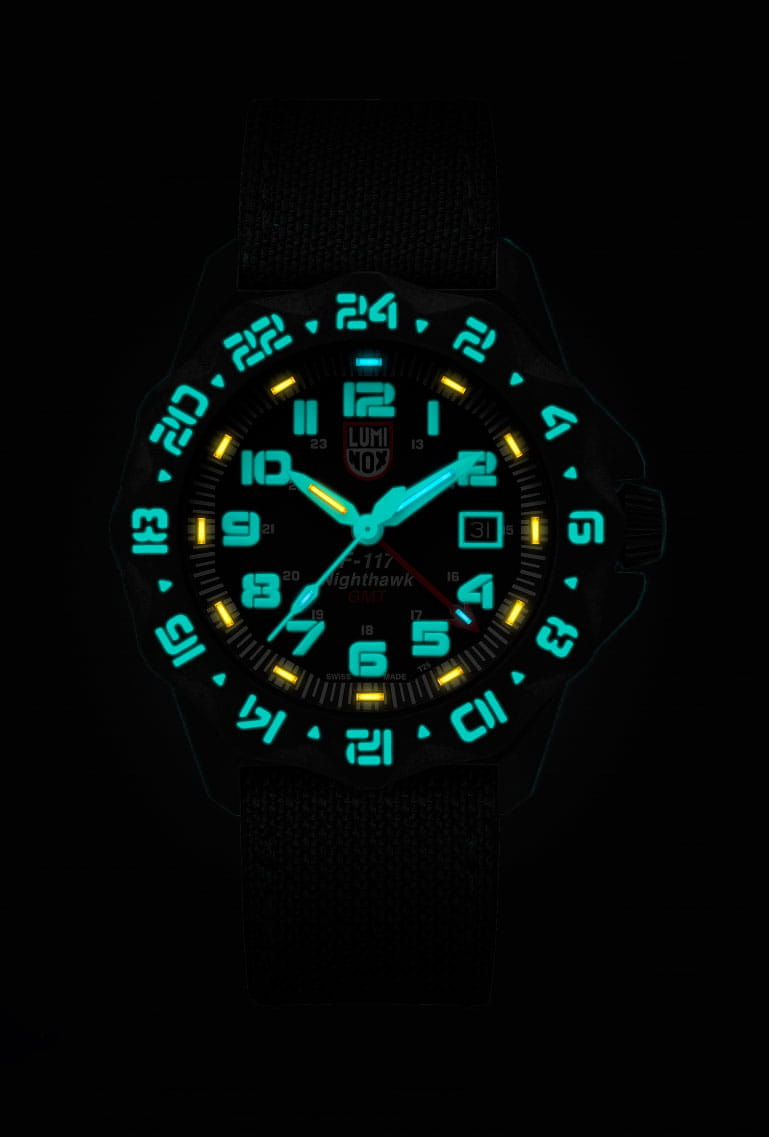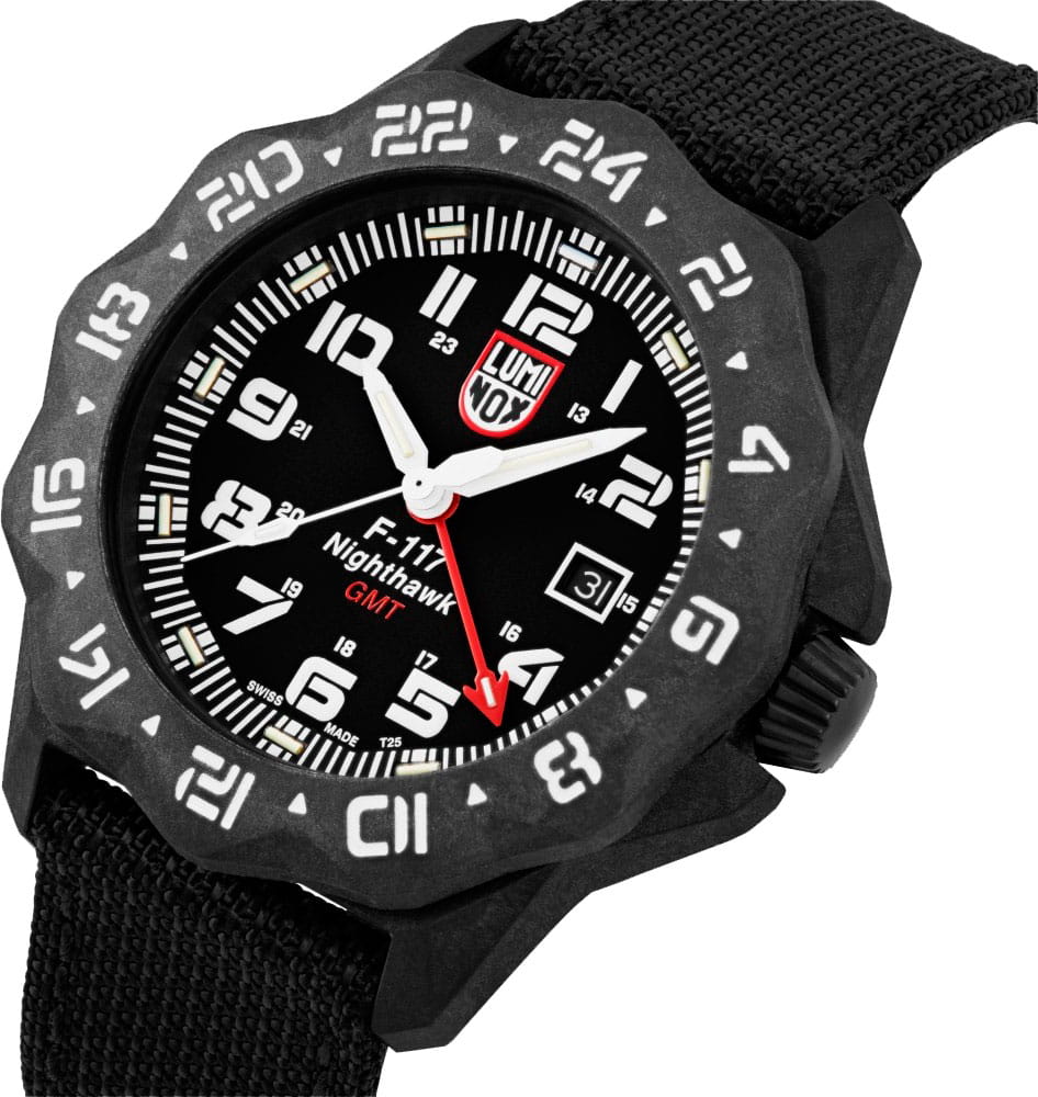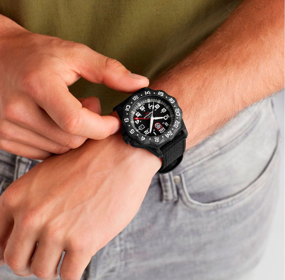 Luminox XA.6441.F — мужская модель из серии 6440 Nighthawk™, созданная с акцентом на надёжность и функциональность. Корпус диаметром 45 мм выполнен из лёгкого и прочного углеродного композита Carbon Core GuardCarbon Core Guard Новейшая структура корпуса, разработанная Casio. Полиуретановая пластина дополнительно усилена карбоновыми вставками, что придаёт специальную защиту от механических повреждений. Карбон отличается лёгкостью и прочностью., а односторонний вращающийся безельБезельВнешний ободок, закрепляющий стекло. В спортивных часах так называется поворотное кольцо с делениями на циферблате, выполняет роль таймера – замеряет отрезки времени на шкале. Неподвижный безель – элемент декора. Однонаправленно вращающийся безель на дайверских часах позволяет фиксировать моменты погружения и выныривания на поверхность. с крупной минутной шкалой обеспечивает удобство при работе под водой. Защитную функцию выполняет сапфировое стеклоСапфировое стеклоПрочный и надёжный материал из кристалла сапфира синтетического происхождения, характеризующийся особой твёрдостью и устойчивостью к царапинам и повреждениям. с антибликовым покрытиемАнтибликовое покрытиеСлой оксида металла в 0,13-0,3 микрон, благодаря которому стекло часов не бликует и не отражает свет. Антибликовое покрытие уменьшает отражение света в 10 раз, обеспечивая отличную читаемость показателей циферблата., повышающим читаемость в любых условиях. В основе лежит швейцарский кварцевый механизм с функциями часов, минут, секунд и даты. Водозащита 200 м (20 бар) делает часы надёжным инструментом для дайвинга. Метки и стрелки оснащены системой Luminox Light Technology с автономной подсветкой до 25 лет, которая работает независимо от внешних источников света. Модель дополнена текстильным ремешком с классической застёжкой, подчёркивающим её практичный и тактический характер.