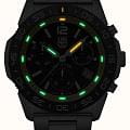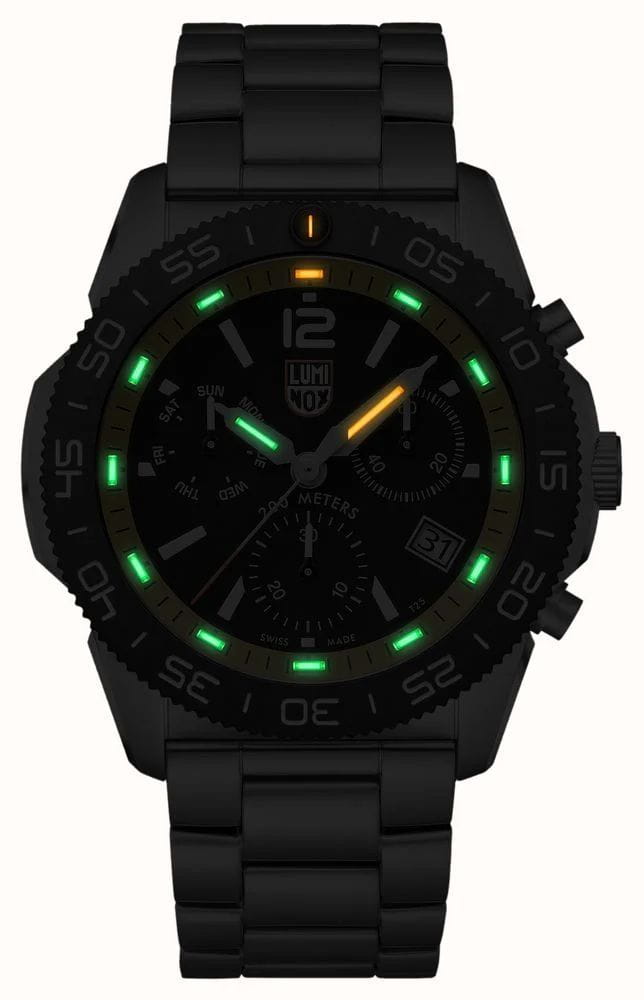 Мужские наручные часы-хронографХронографФункция позволяет измерять отрезки времени с особой точностью: часы, минуты, секунды. Верным признаком хронографа является наличие на циферблате 3 дополнительных окошек-счётчиков. Luminox XS.3145.M из коллекции Pacific Diver сочетают в себе спортивный дизайн и надежность швейцарского качества . Модель обладает круглым корпусом диаметром 44 мм, изготовленным из нержавеющей стали, что обеспечивает высокую устойчивость к внешним воздействиям и долговечность . Циферблат черного цвета украшен контрастными метками и стрелками с люминесцентным покрытиемЛюминесцентное покрытиеПозволяет считывать показания времени в темноте. Производители наносят на стрелки, часовые индексы, безель или поверхность циферблата светонакопительный состав, дающий холодное свечение., гарантирующим постоянную видимость времени даже в условиях низкой освещенности благодаря системе LLTLLTLLT — это автономный механизм подсветки, основанный на использовании микроскопических газонаполненных элементов. Специальные герметичные капсулы из боросиликатного стекла, интегрированные в циферблат, генерируют свечение без необходимости подключения к внешним источникам энергии. Для их работы не требуется ни дополнительный свет, ни механическое воздействие (например, нажатие кнопки). Свечение возникает благодаря химическому процессу: реакция между тритием, заключенным в капсулах, и люминофорным покрытием создает стабильное автономное освещение. Технология обеспечивает энергетическую независимость и долговечность подсветки. (микрогазовые огни) . Часы оснащены кварцевым механизмом швейцарского производства, обеспечивающим точность хода ±15 секунд в месяц . Защиту циферблата обеспечивает прочное сапфировое стеклоСапфировое стеклоПрочный и надёжный материал из кристалла сапфира синтетического происхождения, характеризующийся особой твёрдостью и устойчивостью к царапинам и повреждениям. с антибликовым покрытиемАнтибликовое покрытиеСлой оксида металла в 0,13-0,3 микрон, благодаря которому стекло часов не бликует и не отражает свет. Антибликовое покрытие уменьшает отражение света в 10 раз, обеспечивая отличную читаемость показателей циферблата., устойчивое к царапинам и механическим повреждениям . Водонепроницаемость модели достигает 20 атмосфер (200 метров), что делает их подходящими для плавания и активного отдыха на воде, включая дайвинг . Модель также оснащена безелемБезельВнешний ободок, закрепляющий стекло. В спортивных часах так называется поворотное кольцо с делениями на циферблате, выполняет роль таймера – замеряет отрезки времени на шкале. Неподвижный безель – элемент декора. Однонаправленно вращающийся безель на дайверских часах позволяет фиксировать моменты погружения и выныривания на поверхность. с односторонним вращением, что добавляет функциональности при использовании в водных условиях . Стальной браслет на раскладной застёжкеРаскладная застёжкаТакой тип застёжки используется только на браслетах из металла. Она никогда не раскрывается полностью, происходит разделение на 2 и более частей. Раскладывающая застёжка снизит вероятность потери часов к минимуму.. Дополнительно часы имеют окно даты в положении «4 часа», что делает их практичными для повседневного использования .