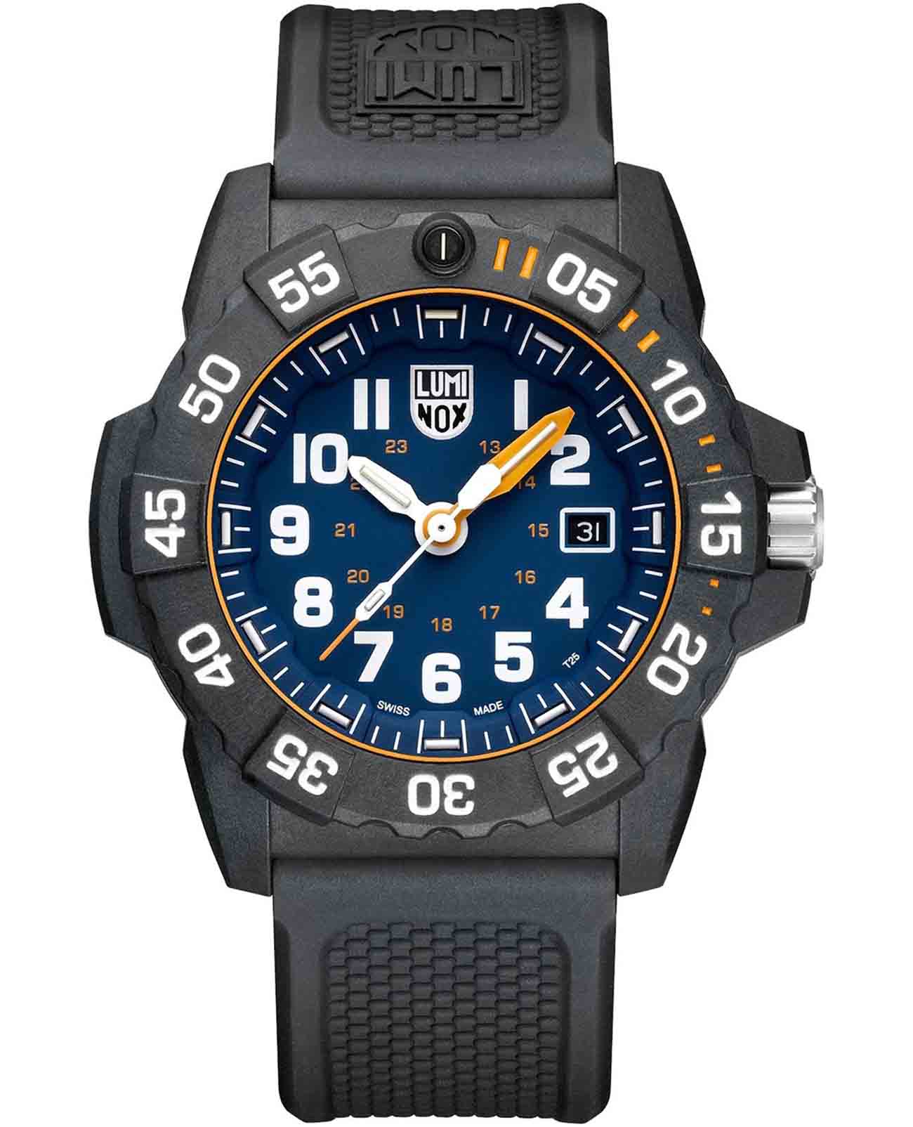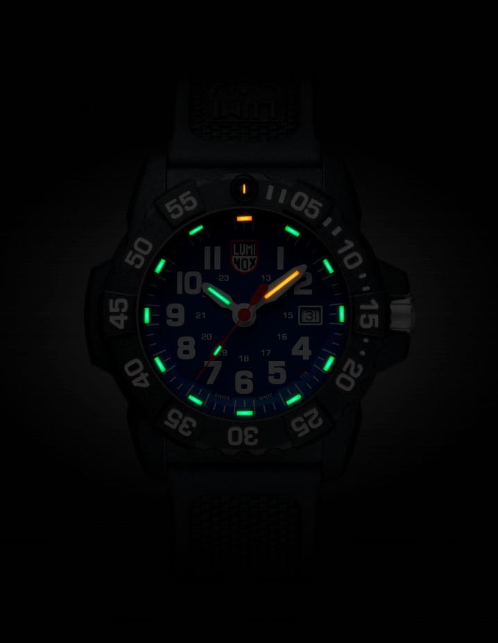 Часы Luminox XS.3503.F — это надежные и стильные швейцарские часы с кварцевым механизмом, оснащенные калибром Ronda 515. Корпус выполнен из пластика, усиленного прессованным карбоном CARBONOX, что обеспечивает прочность и долговечность. Синий циферблат защищен минеральным стекломМинеральное стеклоМинеральное стекло представляет собой искусственно выращенный минерал кварца. Такое стекло отличается особой устойчивостью к повреждениям и царапинам. Уступает по некоторым качествам сапфировому стеклу. повышенной прочности, что делает его устойчивым к царапинам и ударам. Полиуретановый браслет обеспечивает комфортное ношение и надежность фиксации на запястье. Эти часы обладают впечатляющим уровнем водозащиты до 200 метров, что делает их подходящими для водных видов спорта и активного отдыха. Светящаяся метка на безелеБезельВнешний ободок, закрепляющий стекло. В спортивных часах так называется поворотное кольцо с делениями на циферблате, выполняет роль таймера – замеряет отрезки времени на шкале. Неподвижный безель – элемент декора. Однонаправленно вращающийся безель на дайверских часах позволяет фиксировать моменты погружения и выныривания на поверхность., который вращается в одном направлении, добавляет функциональности и удобства, особенно в условиях низкой освещенности. Технология LLTLLTLLT — это автономный механизм подсветки, основанный на использовании микроскопических газонаполненных элементов. Специальные герметичные капсулы из боросиликатного стекла, интегрированные в циферблат, генерируют свечение без необходимости подключения к внешним источникам энергии. Для их работы не требуется ни дополнительный свет, ни механическое воздействие (например, нажатие кнопки). Свечение возникает благодаря химическому процессу: реакция между тритием, заключенным в капсулах, и люминофорным покрытием создает стабильное автономное освещение. Технология обеспечивает энергетическую независимость и долговечность подсветки.-подсветки обеспечивает отличную видимость в темноте на протяжении 25 лет, позволяя контролировать время даже при полном отсутствии света. Часы поддерживают отображение времени в 12- и 24-часовом формате, а наличие календаря с указанием числа добавляет практичности. Заводная головка снабжена защитой и двойной уплотнительной прокладкой для обеспечения герметичности, а задняя крышка крепится на винтах для дополнительной надежности.