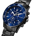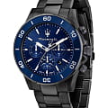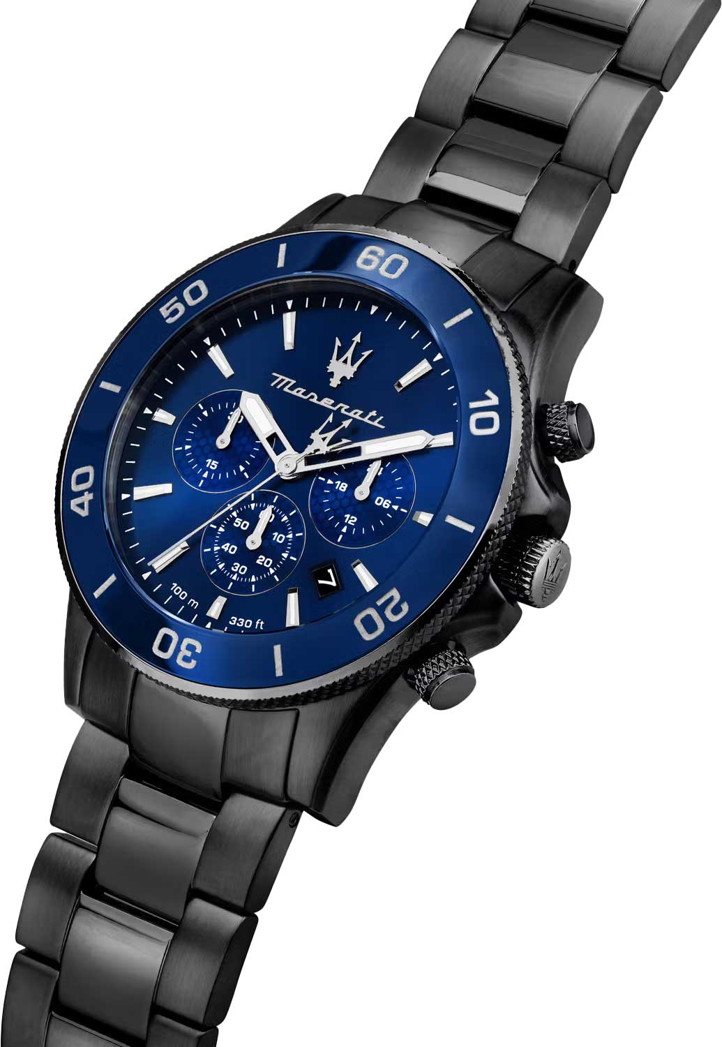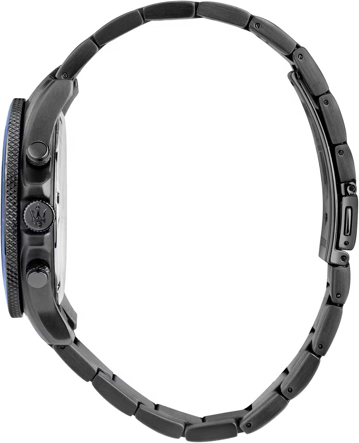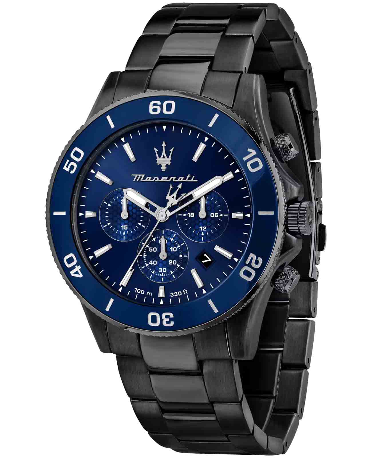 Мужские часы Maserati R8873600005 — это стильное сочетание элегантности и современного дизайна. Корпус из нержавеющей стали с PVD-покрытиемPVDУльтратонкое покрытие наносится в технике вакуумного напыления, сочетает в себе нитрид титана особой прочности со слоем золота или оксида хрома. Несёт в себе декоративную или защитную функцию. диаметром 43 мм идеально сбалансирован и элегантен. Минеральное стеклоМинеральное стеклоМинеральное стекло представляет собой искусственно выращенный минерал кварца. Такое стекло отличается особой устойчивостью к повреждениям и царапинам. Уступает по некоторым качествам сапфировому стеклу. защищает циферблат от царапин. Стальной браслет на застёжке-бабочке с кнопкамиЗастёжка "бабочка"Такой вид застёжки дополняется предохранителями, помогающими избежать случайного раскрытия браслета. Обладают изящным исполнением. идеально дополняют дизайн часов, обеспечивая комфортное ношение. Стрелки и метки с люминесцентным покрытиемЛюминесцентное покрытиеПозволяет считывать показания времени в темноте. Производители наносят на стрелки, часовые индексы, безель или поверхность циферблата светонакопительный состав, дающий холодное свечение.. БезельБезельВнешний ободок, закрепляющий стекло. В спортивных часах так называется поворотное кольцо с делениями на циферблате, выполняет роль таймера – замеряет отрезки времени на шкале. Неподвижный безель – элемент декора. Однонаправленно вращающийся безель на дайверских часах позволяет фиксировать моменты погружения и выныривания на поверхность. с керамической вставкой. Часы обладают впечатляющей водонепроницаемостью до 10 бар (100 метров), что делает их идеальными для повседневной носки. Метки в виде штрихов. Окошко даты с увеличительным стеклом находится в положении 3 часа. Часы-хронографХронографФункция позволяет измерять отрезки времени с особой точностью: часы, минуты, секунды. Верным признаком хронографа является наличие на циферблате 3 дополнительных окошек-счётчиков. оборудованы надёжным кварцевым механизмом с калибром Miyota JS25, обеспечивающим точность и долговечность.