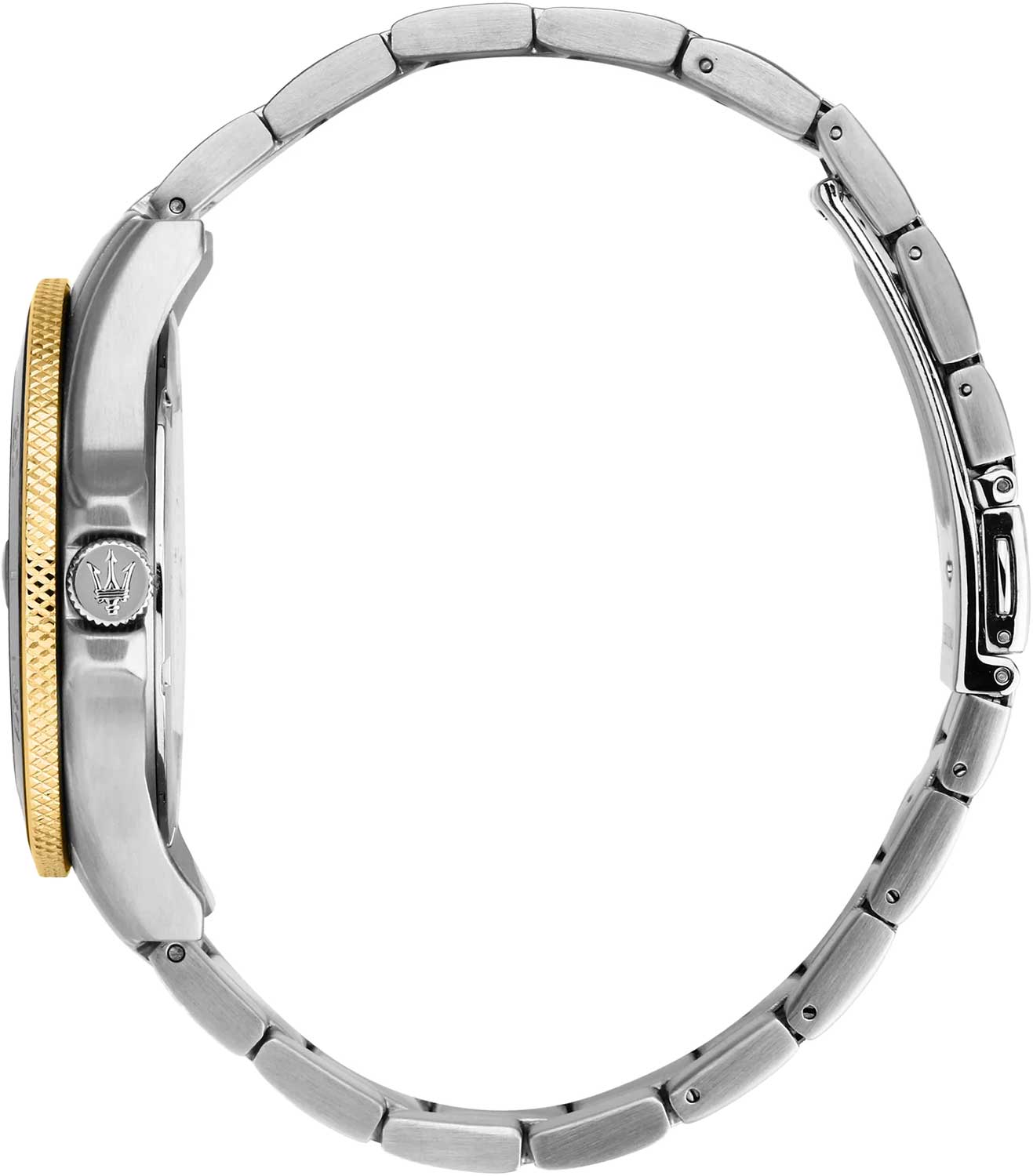 Мужские часы Maserati R8873600010 — это стильное сочетание элегантности и современного дизайна. Корпус из нержавеющей стали с диаметром 43 мм идеально сбалансирован и элегантен. Минеральное стеклоМинеральное стеклоМинеральное стекло представляет собой искусственно выращенный минерал кварца. Такое стекло отличается особой устойчивостью к повреждениям и царапинам. Уступает по некоторым качествам сапфировому стеклу. защищает циферблат от царапин. Стальной браслет с PVD-покрытиемPVDУльтратонкое покрытие наносится в технике вакуумного напыления, сочетает в себе нитрид титана особой прочности со слоем золота или оксида хрома. Несёт в себе декоративную или защитную функцию. на застёжке-бабочке с кнопкамиЗастёжка "бабочка"Такой вид застёжки дополняется предохранителями, помогающими избежать случайного раскрытия браслета. Обладают изящным исполнением. идеально дополняют дизайн часов, обеспечивая комфортное ношение. Стрелки и метки с люминесцентным покрытиемЛюминесцентное покрытиеПозволяет считывать показания времени в темноте. Производители наносят на стрелки, часовые индексы, безель или поверхность циферблата светонакопительный состав, дающий холодное свечение.. БезельБезельВнешний ободок, закрепляющий стекло. В спортивных часах так называется поворотное кольцо с делениями на циферблате, выполняет роль таймера – замеряет отрезки времени на шкале. Неподвижный безель – элемент декора. Однонаправленно вращающийся безель на дайверских часах позволяет фиксировать моменты погружения и выныривания на поверхность. с керамической вставкой. Часы обладают впечатляющей водонепроницаемостью до 10 бар (100 метров), что делает их идеальными для повседневной носки. Метки в виде штрихов. Окошко даты с увеличительным стеклом находится в положении 3 часа.