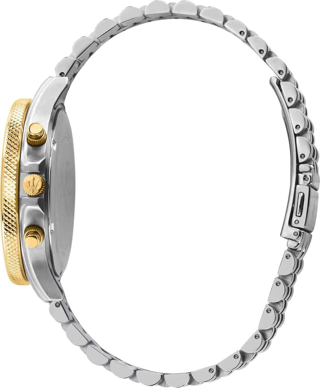 Часы Maserati Sfida R8873640024 представляют собой воплощение итальянской элегантности и технологической точности. Эти часы-хронографХронографФункция позволяет измерять отрезки времени с особой точностью: часы, минуты, секунды. Верным признаком хронографа является наличие на циферблате 3 дополнительных окошек-счётчиков. оборудованы надёжным кварцевым механизмом с калибром Miyota JS25, обеспечивающим точность и долговечность. Корпус диаметром 44 мм выполнен из стали и украшен керамической вставкой, что придаёт им современный и стильный вид. Серебристый циферблат, выполненный по технологии Sunray, эффектно играет на свету, создавая впечатление солнечных лучей. Он украшен фирменным логотипом «Maserati» и метками в виде штрихов, а также содержит окошко даты, расположенное между отметками 4 и 5 часов. Функциональность часов подчёркнута наличием секундомераСекундомерСекундоме́р — прибор, способный измерять интервалы времени с точностью до долей секунды. и возможностью выбора 12-ти или 24-х часового формата времени. БезельБезельВнешний ободок, закрепляющий стекло. В спортивных часах так называется поворотное кольцо с делениями на циферблате, выполняет роль таймера – замеряет отрезки времени на шкале. Неподвижный безель – элемент декора. Однонаправленно вращающийся безель на дайверских часах позволяет фиксировать моменты погружения и выныривания на поверхность. с золотистым и черным PVDPVDУльтратонкое покрытие наносится в технике вакуумного напыления, сочетает в себе нитрид титана особой прочности со слоем золота или оксида хрома. Несёт в себе декоративную или защитную функцию. покрытием имеет шкалу тахиметраТахиметрРазмеченная шкала, располагается на ободке или безеле часов. Тахиметр позволяет рассчитать скорость на определённом участке пути, расстояние измеряется в километрах или милях.. Люминесцентное покрытиеЛюминесцентное покрытиеПозволяет считывать показания времени в темноте. Производители наносят на стрелки, часовые индексы, безель или поверхность циферблата светонакопительный состав, дающий холодное свечение. на стрелках обеспечивает отличную видимость в темноте. Минеральное стеклоМинеральное стеклоМинеральное стекло представляет собой искусственно выращенный минерал кварца. Такое стекло отличается особой устойчивостью к повреждениям и царапинам. Уступает по некоторым качествам сапфировому стеклу. защищает циферблат, а завинчивающаяся задняя крышка и заводная головка с защитой гарантируют водозащиту до 100WR, позволяя без опасений использовать часы в различных условиях. Стальной браслет с частичным PVDPVDУльтратонкое покрытие наносится в технике вакуумного напыления, сочетает в себе нитрид титана особой прочности со слоем золота или оксида хрома. Несёт в себе декоративную или защитную функцию. покрытием и раскладной застёжкойРаскладная застёжкаТакой тип застёжки используется только на браслетах из металла. Она никогда не раскрывается полностью, происходит разделение на 2 и более частей. Раскладывающая застёжка снизит вероятность потери часов к минимуму. обеспечивает комфортное ношение и надёжную фиксацию на запястье. Эти часы идеально подойдут для тех, кто ценит стиль и функциональность в одном аксессуаре.