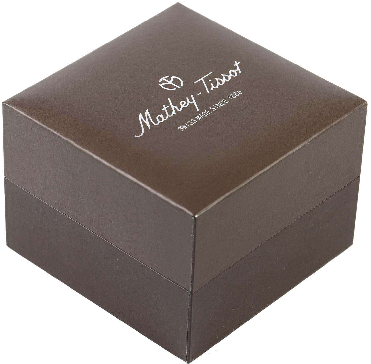 Мужские кварцевые часы-хронографХронографФункция позволяет измерять отрезки времени с особой точностью: часы, минуты, секунды. Верным признаком хронографа является наличие на циферблате 3 дополнительных окошек-счётчиков. Mathey-Tissot Zeus H118CHRS — это стильное сочетание элегантности и современного дизайна. Изящный корпус выполнен из нержавеющей стали, диаметром 41 мм и толщиной 11,5 мм , что придаст образу элегантности и надежности. Изысканный циферблат с метками в виде штрихов придает модели особый блеск. Циферблат защищен сапфировым стекломСапфировое стеклоПрочный и надёжный материал из кристалла сапфира синтетического происхождения, характеризующийся особой твёрдостью и устойчивостью к царапинам и повреждениям., обеспечивающий устойчивость к царапинам. Неподвижный безельБезельВнешний ободок, закрепляющий стекло. В спортивных часах так называется поворотное кольцо с делениями на циферблате, выполняет роль таймера – замеряет отрезки времени на шкале. Неподвижный безель – элемент декора. Однонаправленно вращающийся безель на дайверских часах позволяет фиксировать моменты погружения и выныривания на поверхность. с PVD-покрытиемPVDУльтратонкое покрытие наносится в технике вакуумного напыления, сочетает в себе нитрид титана особой прочности со слоем золота или оксида хрома. Несёт в себе декоративную или защитную функцию. цвета розового золота. Стрелки и метки с люминесцентным покрытиемЛюминесцентное покрытиеПозволяет считывать показания времени в темноте. Производители наносят на стрелки, часовые индексы, безель или поверхность циферблата светонакопительный состав, дающий холодное свечение. SuperLumiNova, которое светится в темноте после непродолжительной зарядки на свету. Окошко даты находится в положении 4 часа. Часы оснащены надежным кварцевым механизмом. Стальной браслет с частичным PVD-покрытиемPVDУльтратонкое покрытие наносится в технике вакуумного напыления, сочетает в себе нитрид титана особой прочности со слоем золота или оксида хрома. Несёт в себе декоративную или защитную функцию. на застёжке-бабочке с кнопкамиЗастёжка "бабочка"Такой вид застёжки дополняется предохранителями, помогающими избежать случайного раскрытия браслета. Обладают изящным исполнением. , гарантирует комфортное и безопасное ношение. Класс водозащиты: 50 метров позволит защитить корпус от случайных брызг или капель дождя. Mathey-Tissot — отличный выбор для тех, кто ценит утонченность и качество.