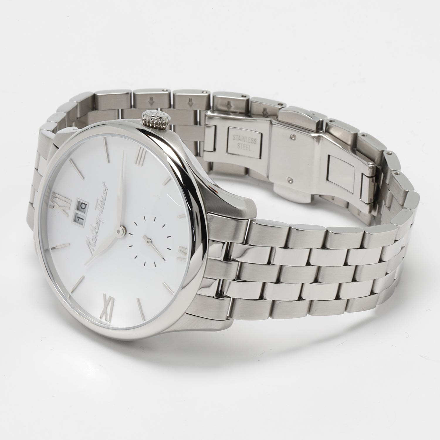Мужские кварцевые часы Mathey-Tissot Edmond Metal H1886MAI — это стильное сочетание элегантности и современного дизайна. Изящный корпус выполнен из нержавеющей стали, диаметром 42 мм, что придаст образу элегантности и надежности. Изысканный циферблат с метками в виде штрихов и римских цифр придает модели особый блеск. Циферблат защищен минеральным стекломМинеральное стеклоМинеральное стекло представляет собой искусственно выращенный минерал кварца. Такое стекло отличается особой устойчивостью к повреждениям и царапинам. Уступает по некоторым качествам сапфировому стеклу. с сапфировым покрытием, обеспечивает устойчивость к царапинам. Окошко даты находится в положении 12 часов. Стальной браслет на застёжке-бабочке с кнопкамиЗастёжка "бабочка"Такой вид застёжки дополняется предохранителями, помогающими избежать случайного раскрытия браслета. Обладают изящным исполнением. , гарантирует комфортное и безопасное ношение. Секундная стрелка вынесена на отдельный циферблат. Рифленая заводная головка. Класс водозащиты: 50 метров позволит защитить корпус от случайных брызг или капель дождя. Mathey-Tissot  — отличный выбор для тех, кто ценит утонченность и качество.