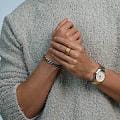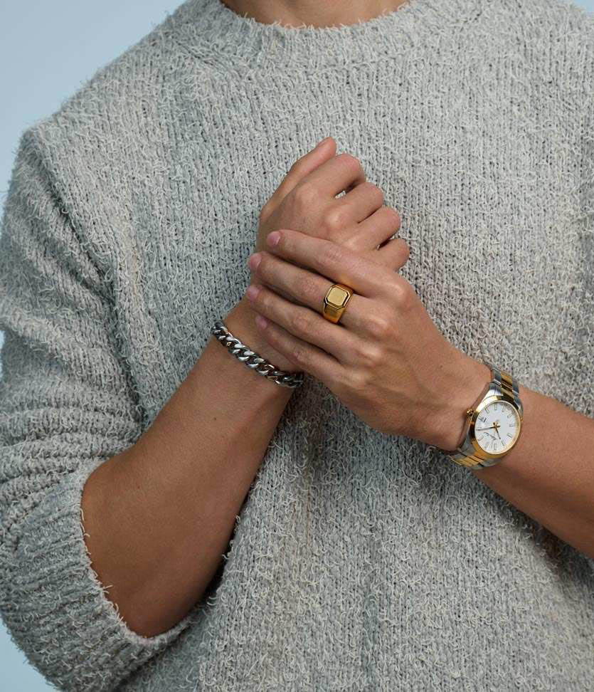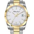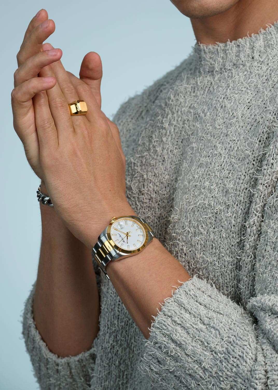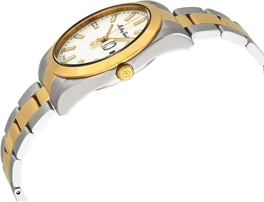 Мужские кварцевые часы Mathey-Tissot Mathy H450BI — это стильное сочетание элегантности и современного дизайна. Изящный корпус выполнен из нержавеющей стали, диаметром 40 мм, что придаст образу элегантности и надежности. Изысканный циферблат с метками в виде штрихов придает модели особый блеск. Циферблат защищен минеральным стекломМинеральное стеклоМинеральное стекло представляет собой искусственно выращенный минерал кварца. Такое стекло отличается особой устойчивостью к повреждениям и царапинам. Уступает по некоторым качествам сапфировому стеклу., обеспечивает устойчивость к царапинам. Стрелки с люминесцентным покрытиемЛюминесцентное покрытиеПозволяет считывать показания времени в темноте. Производители наносят на стрелки, часовые индексы, безель или поверхность циферблата светонакопительный состав, дающий холодное свечение.. БезельБезельВнешний ободок, закрепляющий стекло. В спортивных часах так называется поворотное кольцо с делениями на циферблате, выполняет роль таймера – замеряет отрезки времени на шкале. Неподвижный безель – элемент декора. Однонаправленно вращающийся безель на дайверских часах позволяет фиксировать моменты погружения и выныривания на поверхность. с PVD-покрытиемPVDУльтратонкое покрытие наносится в технике вакуумного напыления, сочетает в себе нитрид титана особой прочности со слоем золота или оксида хрома. Несёт в себе декоративную или защитную функцию. золотистого цвета. Окошко даты находится в положении 3 часа. Часы оснащены надежным кварцевым механизмом. Стальной браслет с частичным PVD-покрытиемPVDУльтратонкое покрытие наносится в технике вакуумного напыления, сочетает в себе нитрид титана особой прочности со слоем золота или оксида хрома. Несёт в себе декоративную или защитную функцию. на раскладной застёжке с фиксаторомРаскладная застёжкаТакой тип застёжки используется только на браслетах из металла. Она никогда не раскрывается полностью, происходит разделение на 2 и более частей. Раскладывающая застёжка снизит вероятность потери часов к минимуму., гарантирует комфортное и безопасное ношение. Рифленая заводная головка. Класс водозащиты: 50 метров позволит защитить корпус от случайных брызг или капель дождя. Mathey-Tissot — отличный выбор для тех, кто ценит утонченность и качество.