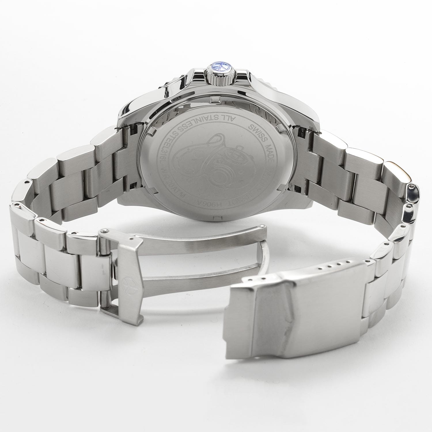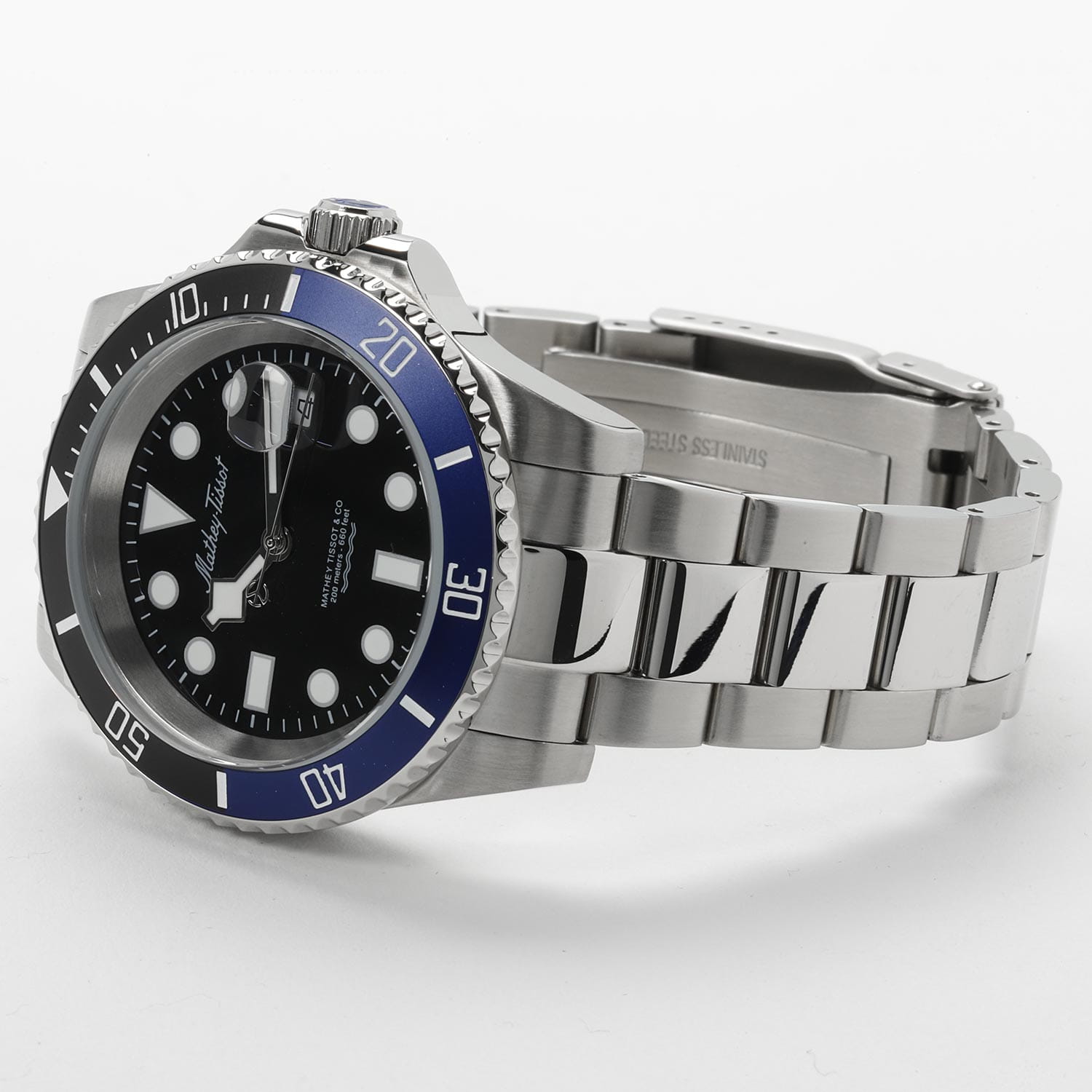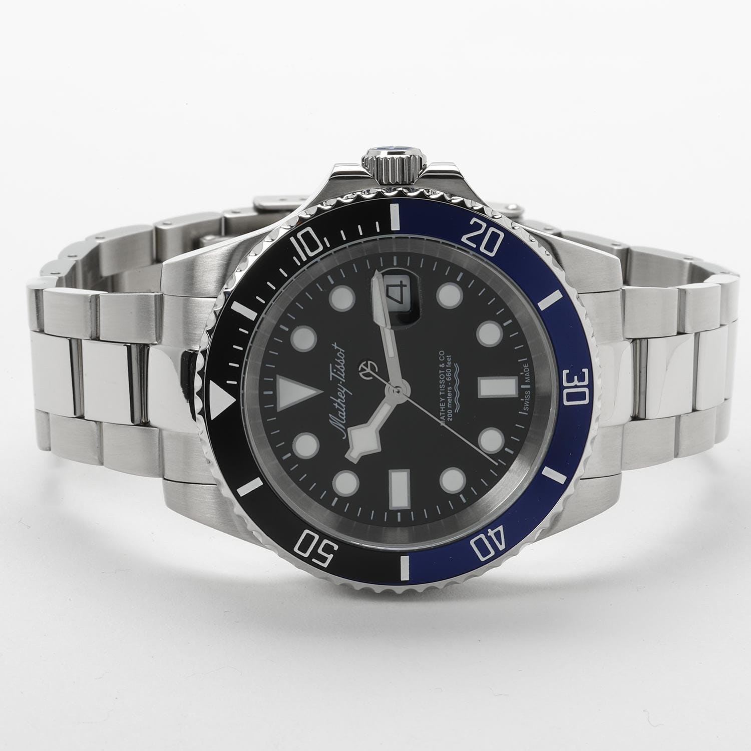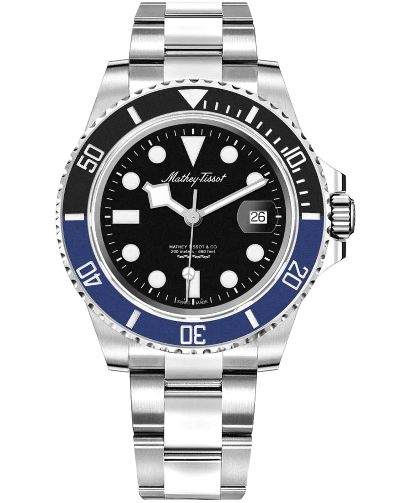 Мужские кварцевые часы Mathey-Tissot Mathy H906ANB — это стильное сочетание элегантности и современного дизайна. Изящный корпус выполнен из нержавеющей стали, диаметром 43,5 мм, что придаст образу элегантности и надежности. Изысканный циферблат с метками в виде точек придает модели особый блеск. Циферблат защищен минеральным стекломМинеральное стеклоМинеральное стекло представляет собой искусственно выращенный минерал кварца. Такое стекло отличается особой устойчивостью к повреждениям и царапинам. Уступает по некоторым качествам сапфировому стеклу. с сапфировым покрытием, обеспечивает устойчивость к царапинам. БезельБезельВнешний ободок, закрепляющий стекло. В спортивных часах так называется поворотное кольцо с делениями на циферблате, выполняет роль таймера – замеряет отрезки времени на шкале. Неподвижный безель – элемент декора. Однонаправленно вращающийся безель на дайверских часах позволяет фиксировать моменты погружения и выныривания на поверхность. с PVD-покрытиемPVDУльтратонкое покрытие наносится в технике вакуумного напыления, сочетает в себе нитрид титана особой прочности со слоем золота или оксида хрома. Несёт в себе декоративную или защитную функцию. черно-синего цвета. Стрелки и метки с люминесцентным покрытиемЛюминесцентное покрытиеПозволяет считывать показания времени в темноте. Производители наносят на стрелки, часовые индексы, безель или поверхность циферблата светонакопительный состав, дающий холодное свечение.. Окошко даты находится в положении 3 часа. Часы оснащены надежным кварцевым механизмом. Стальной браслет на раскладной застёжке с фиксаторомРаскладная застёжкаТакой тип застёжки используется только на браслетах из металла. Она никогда не раскрывается полностью, происходит разделение на 2 и более частей. Раскладывающая застёжка снизит вероятность потери часов к минимуму., гарантирует комфортное и безопасное ношение. Рифленая заводная головка. Класс водозащиты: 200 метров, позволит плавать нырять и заниматься другими водными видами спорта. Mathey-Tissot  — отличный выбор для тех, кто ценит утонченность и качество.
