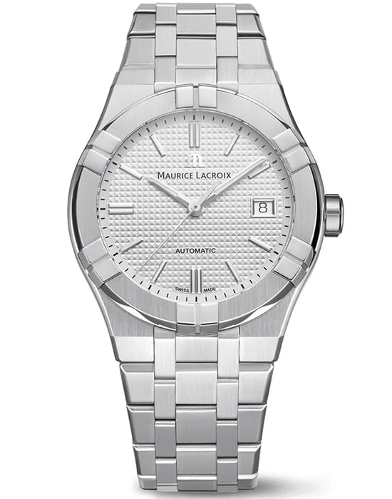Maurice Lacroix AIKON Automatic Date AI6007-SS002-130-1 — элегантные швейцарские часы, сочетающие современный дизайн и высококачественные материалы. Корпус выполнен из нержавеющей стали диаметром 39 мм, создавая современный и универсальный облик. Сапфировое стеклоСапфировое стеклоПрочный и надёжный материал из кристалла сапфира синтетического происхождения, характеризующийся особой твёрдостью и устойчивостью к царапинам и повреждениям. с антибликовым покрытиемАнтибликовое покрытиеСлой оксида металла в 0,13-0,3 микрон, благодаря которому стекло часов не бликует и не отражает свет. Антибликовое покрытие уменьшает отражение света в 10 раз, обеспечивая отличную читаемость показателей циферблата. защищает циферблат и обеспечивает отличную читаемость. Серебристый циферблат с узором "Clous de Paris" придаёт модели глубину и изысканность. Браслет из нержавеющей стали на застёжке-бабочке с кнопкамиЗастёжка "бабочка"Такой вид застёжки дополняется предохранителями, помогающими избежать случайного раскрытия браслета. Обладают изящным исполнением. гарантирует комфорт и надёжность при ношении. Функциональность дополняется индикацией даты в положении "3 часа" и центральными стрелками для часов, минут и секунд. Водонепроницаемость 200 метров делает модель подходящей для плавания и сноркелинга.