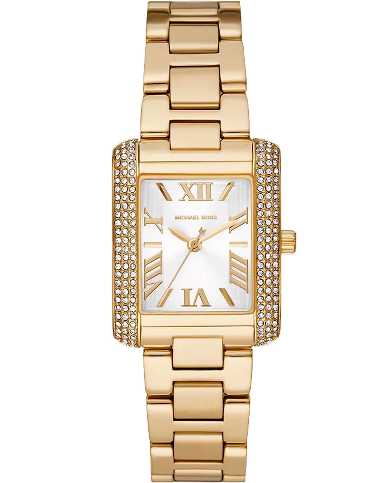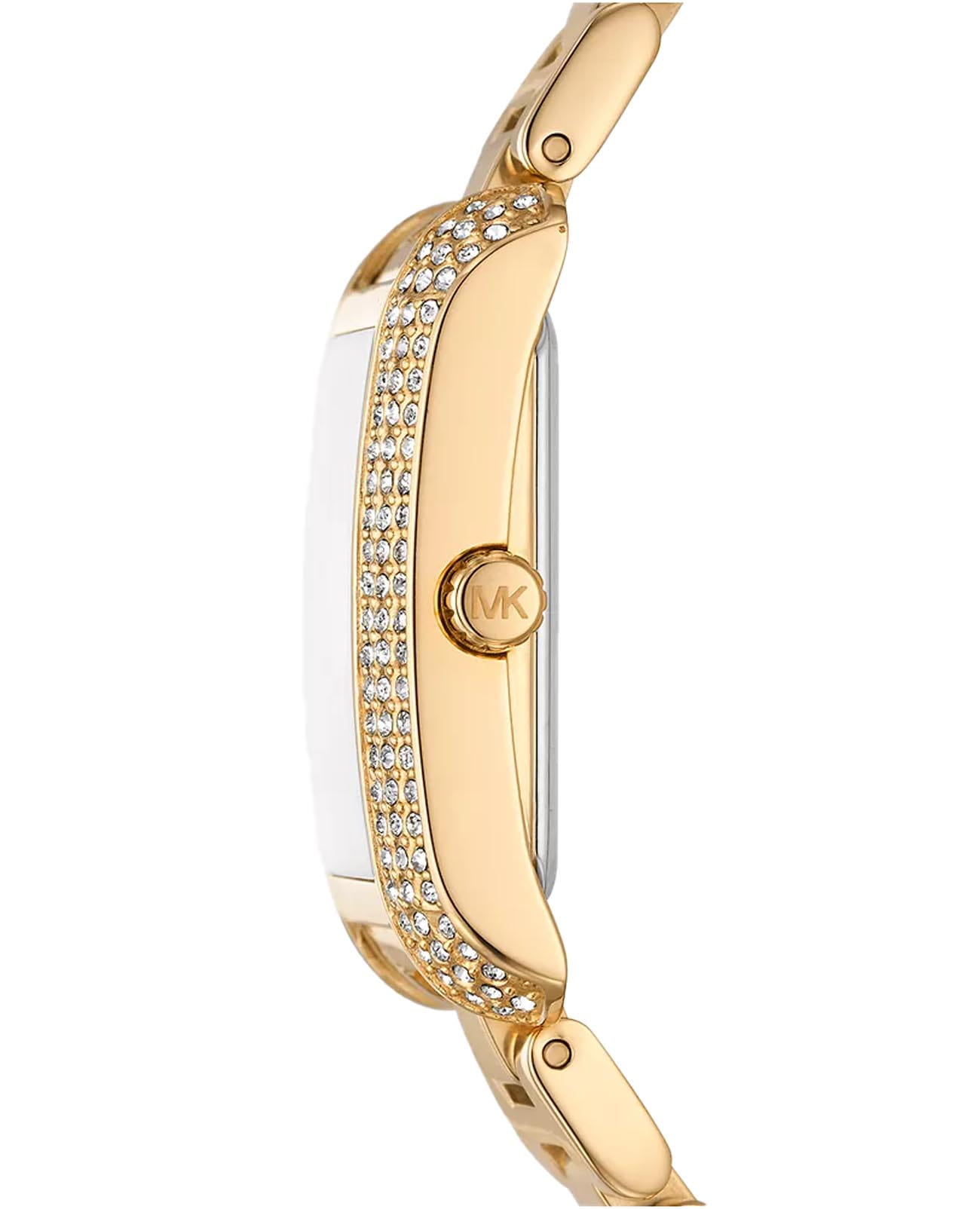 Женские американские наручные часы с минеральным стекломМинеральное стеклоМинеральное стекло представляет собой искусственно выращенный минерал кварца. Такое стекло отличается особой устойчивостью к повреждениям и царапинам. Уступает по некоторым качествам сапфировому стеклу. Michael Kors Emery MK4643, кварцевый механизм с высокой точностью. Минеральное стеклоМинеральное стеклоМинеральное стекло представляет собой искусственно выращенный минерал кварца. Такое стекло отличается особой устойчивостью к повреждениям и царапинам. Уступает по некоторым качествам сапфировому стеклу. устойчивое к появлению царапин, обладающее высокой прозрачностью. Корпус и браслет часов изготовлены из нержавеющей стали с PVD-покрытиемPVDУльтратонкое покрытие наносится в технике вакуумного напыления, сочетает в себе нитрид титана особой прочности со слоем золота или оксида хрома. Несёт в себе декоративную или защитную функцию.. БезельБезельВнешний ободок, закрепляющий стекло. В спортивных часах так называется поворотное кольцо с делениями на циферблате, выполняет роль таймера – замеряет отрезки времени на шкале. Неподвижный безель – элемент декора. Однонаправленно вращающийся безель на дайверских часах позволяет фиксировать моменты погружения и выныривания на поверхность. из нержавеющей стали украшен кристаллами. Класс водозащиты: 50 метров, позволит защитить корпус от случайных брызг или капель дождя. Стальной браслет на раскладной застёжкеРаскладная застёжкаТакой тип застёжки используется только на браслетах из металла. Она никогда не раскрывается полностью, происходит разделение на 2 и более частей. Раскладывающая застёжка снизит вероятность потери часов к минимуму..