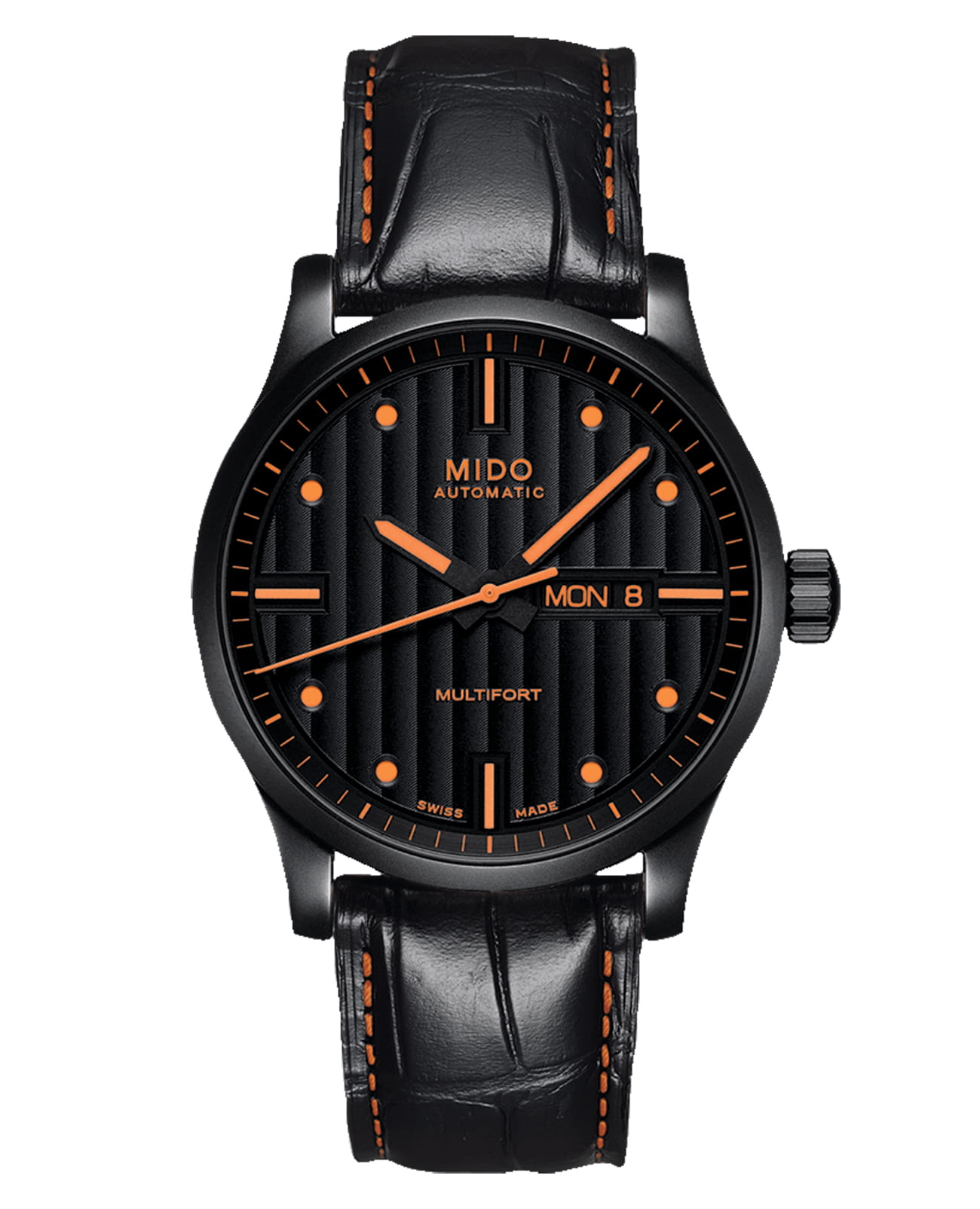 Мужские швейцарские механические часы Mido Multifort M005.430.36.051.80, механический механизм (автоматический калибр) с высокой точностью. Сапфировое стекло устойчивое к появлению царапин, обладающее высокой прозрачностью. Благодаря трем счетчикам, черному циферблату и оранжевым накладным меткам и стрелкам эти часы-хронограф Multifort Chronograph Special Edition выглядят чрезвычайно эффектно. Класс водозащиты: 100 метров, позволит плавать, нырять и заниматься другими водными видами спорта. Корпус часов изготовлен из стали, с PVD покрытием черного цвета. Часы предлагаются в комплекте с двумя сменными ремешками черного и оранжевого цвета.