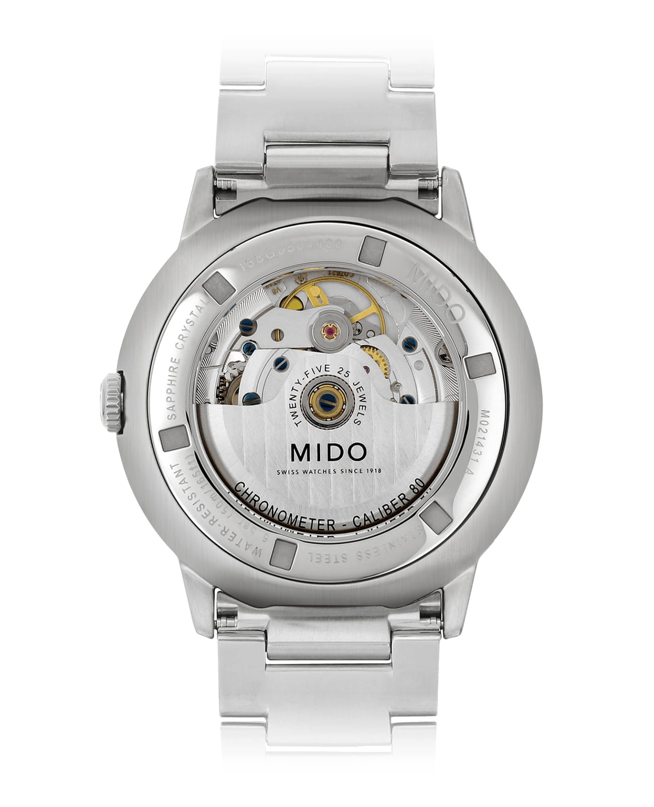 Модель оснащена автоматическим механизмом MIDO Caliber 80.621 (на базе ETA C07.611), сертифицированным как хронометр C.O.S.C., с запасом хода до 80 часов. Функционал включает индикацию часов, минут, секунд, дня недели и даты, расположенных в положении «3 часа».