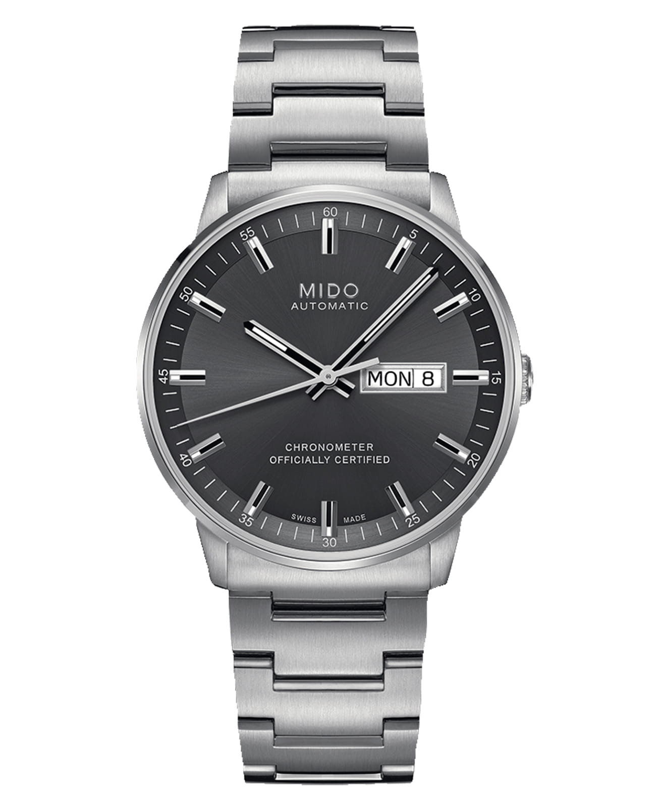 Часы MIDO Commander Chronometer (артикул M021.431.11.061.00) — элегантная модель, сочетающая современный дизайн и швейцарское качество. Корпус диаметром 40 мм выполнен из нержавеющей стали с водозащитой до 5 бар (50 метров). Антрацитовый циферблат с солнечным узором и накладными часовыми метками, покрытыми Super-LumiNova®Люминесцентное покрытиеПозволяет считывать показания времени в темноте. Производители наносят на стрелки, часовые индексы, безель или поверхность циферблата светонакопительный состав, дающий холодное свечение., защищён сапфировым стекломСапфировое стеклоПрочный и надёжный материал из кристалла сапфира синтетического происхождения, характеризующийся особой твёрдостью и устойчивостью к царапинам и повреждениям..