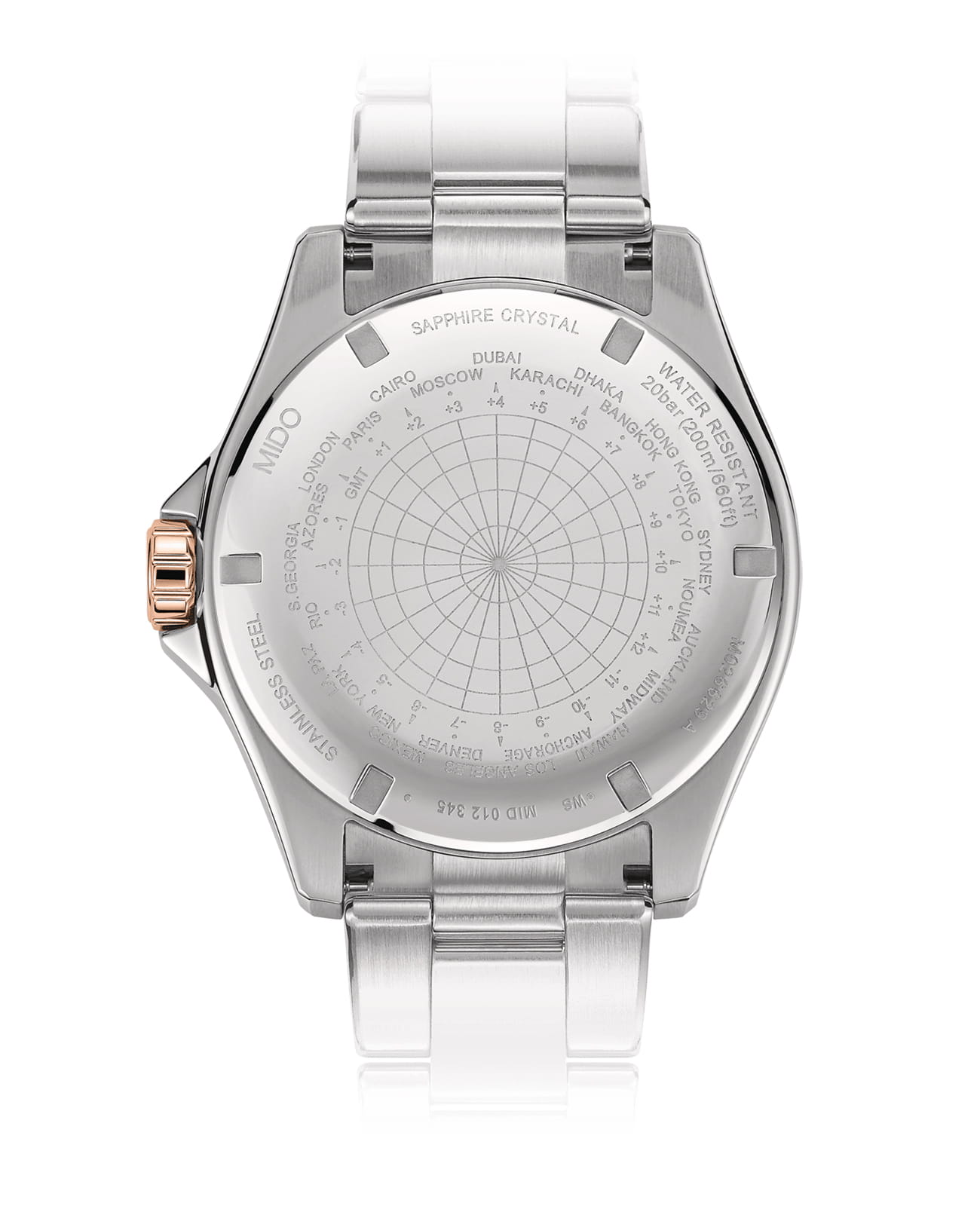 Модель оснащена автоматическим механизмом MIDO Caliber 80 (на базе ETA C07.661), обеспечивающим запас хода до 80 часов. Функционал включает индикацию часов, минут, секунд, даты в положении «3 часа» и второго часового пояса GMTGMTОтображение времени второго часового пояса.Такая функция особенно актуальна для путешественников и бизнесменов,которые общаются с людьми из разных стран,теперь вы всегда будете знать,какой час у вашего партнёра или близкого человека..