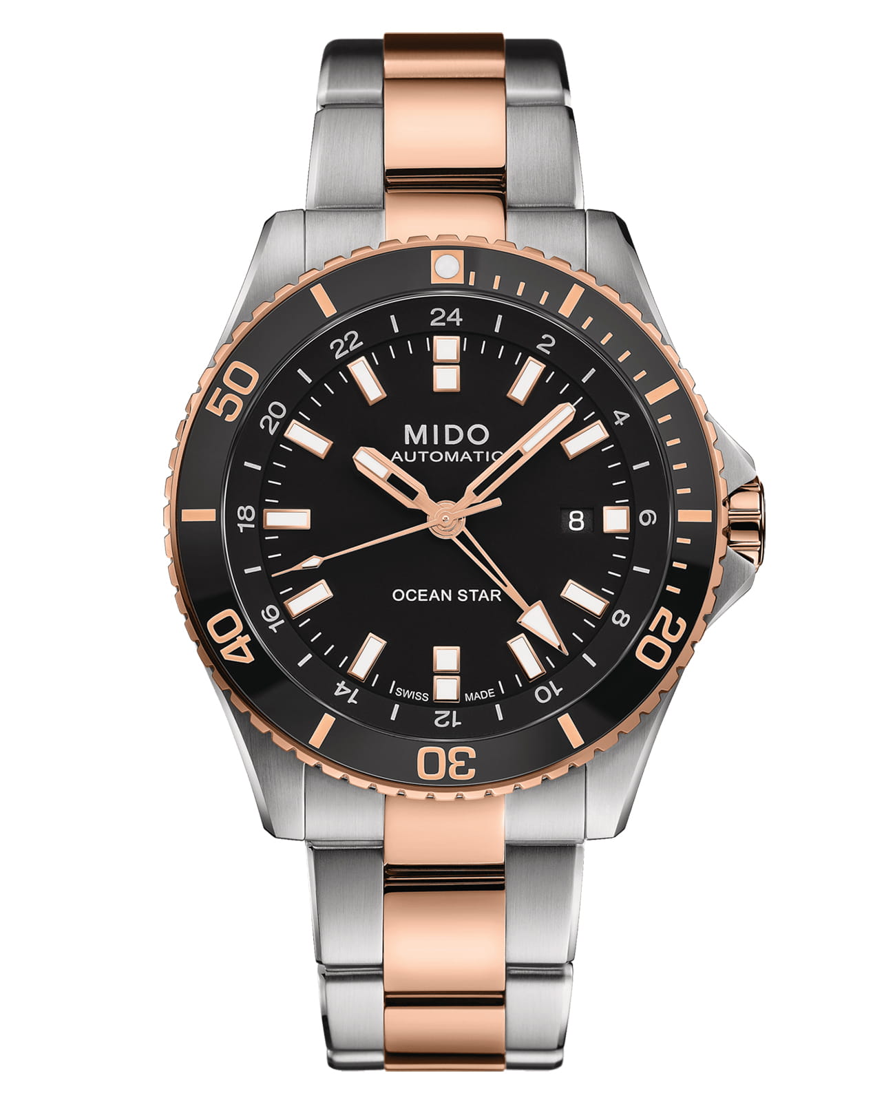 Часы MIDO Ocean Star GMT (артикул M026.629.22.051.00) сочетают элегантность и функциональность, идеально подходя для путешественников и любителей водных видов спорта. Корпус диаметром 44 мм выполнен из нержавеющей стали с PVD-покрытиемPVDУльтратонкое покрытие наносится в технике вакуумного напыления, сочетает в себе нитрид титана особой прочности со слоем золота или оксида хрома. Несёт в себе декоративную или защитную функцию. розового золота и керамическим безелем. Водозащита до 20 бар (200 метров) и завинчивающаяся заводная головка обеспечивают надёжность. Чёрный циферблат с накладными часовыми метками, покрытыми Super-LumiNova®Люминесцентное покрытиеПозволяет считывать показания времени в темноте. Производители наносят на стрелки, часовые индексы, безель или поверхность циферблата светонакопительный состав, дающий холодное свечение., защищён сапфировым стекломСапфировое стеклоПрочный и надёжный материал из кристалла сапфира синтетического происхождения, характеризующийся особой твёрдостью и устойчивостью к царапинам и повреждениям. с двусторонним антибликовым покрытием.