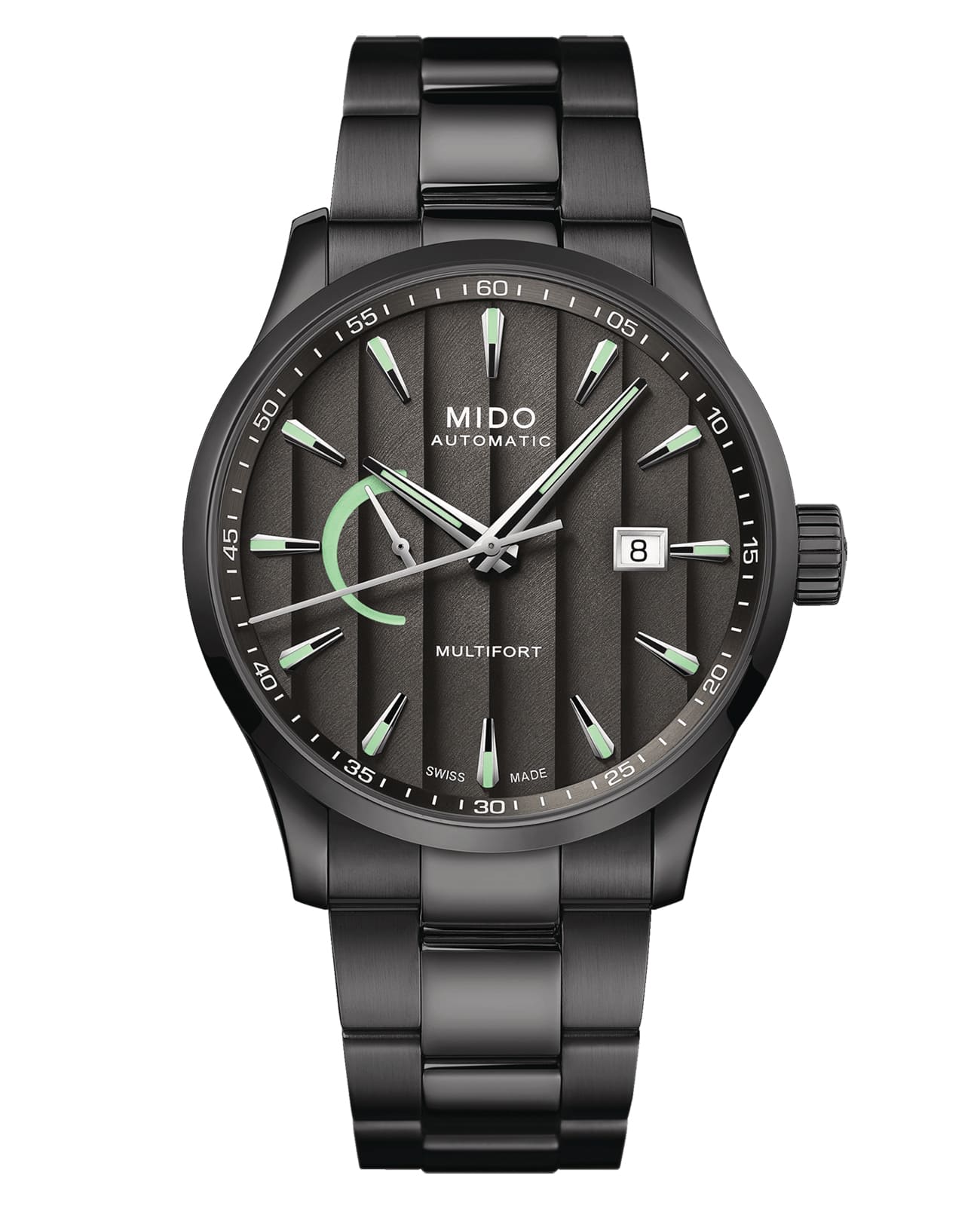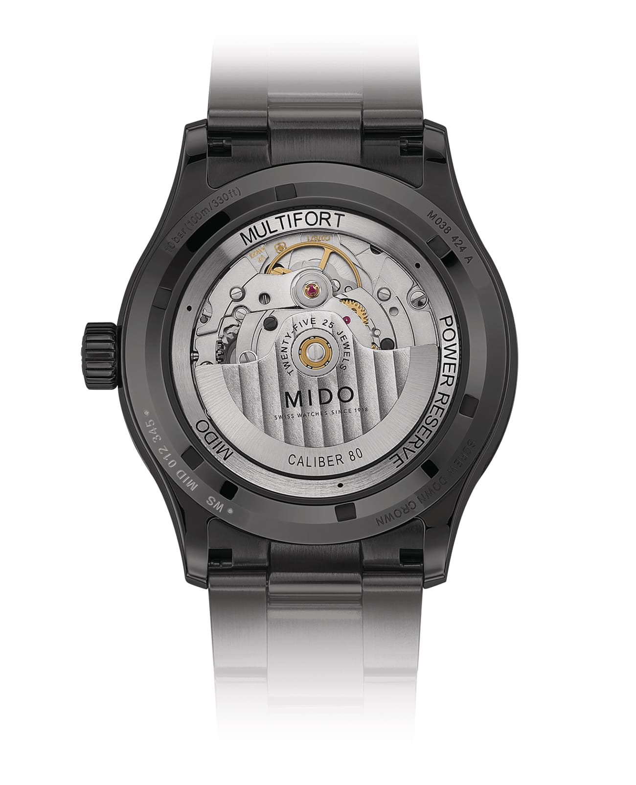 Часы MIDO Multifort Power Reserve (артикул M038.424.33.061.00) сочетают спортивный и городской дизайн, подчёркивая надёжность и элегантность. Корпус диаметром 42 мм выполнен из нержавеющей стали с антрацитовым PVD-покрытиемPVDУльтратонкое покрытие наносится в технике вакуумного напыления, сочетает в себе нитрид титана особой прочности со слоем золота или оксида хрома. Несёт в себе декоративную или защитную функцию. и водозащитой до 10 бар (100 метров). Прозрачная задняя крышка подчёркивает изысканный механизм. Антрацитовый циферблат с узором «Côtes de Genève» и накладными часовыми метками оснащён покрытием Super-LumiNova®Люминесцентное покрытиеПозволяет считывать показания времени в темноте. Производители наносят на стрелки, часовые индексы, безель или поверхность циферблата светонакопительный состав, дающий холодное свечение. для отличной читаемости. Индикатор запаса хода расположен в положении «9 часов», а окошко даты — в положении «3 часа». Циферблат защищён сапфировым стекломСапфировое стеклоПрочный и надёжный материал из кристалла сапфира синтетического происхождения, характеризующийся особой твёрдостью и устойчивостью к царапинам и повреждениям. с антибликовым покрытием.