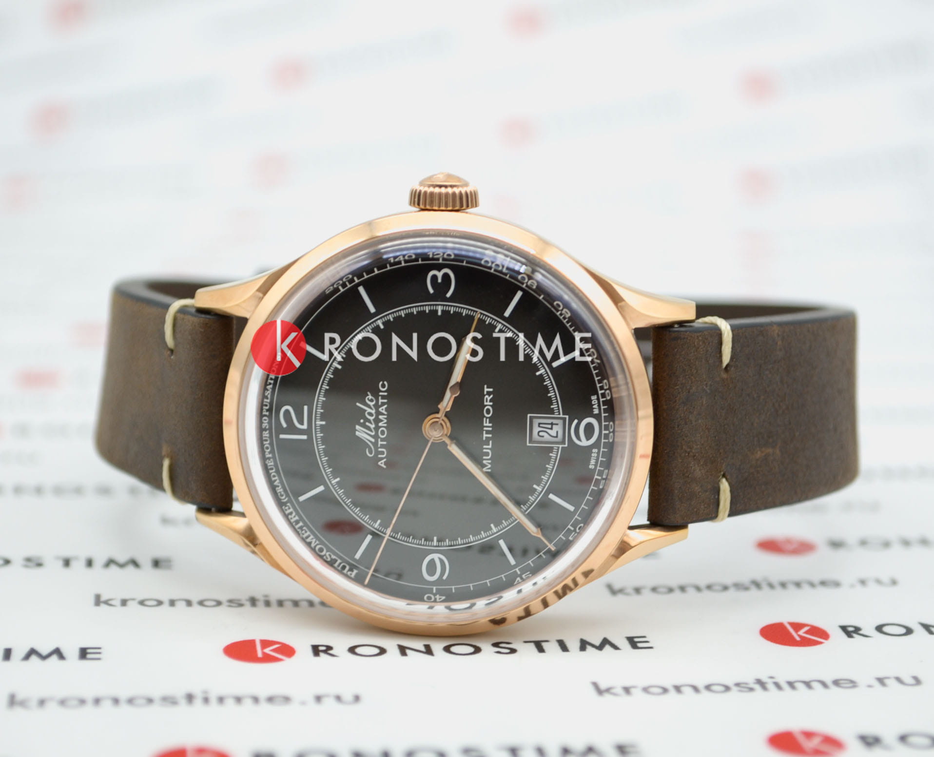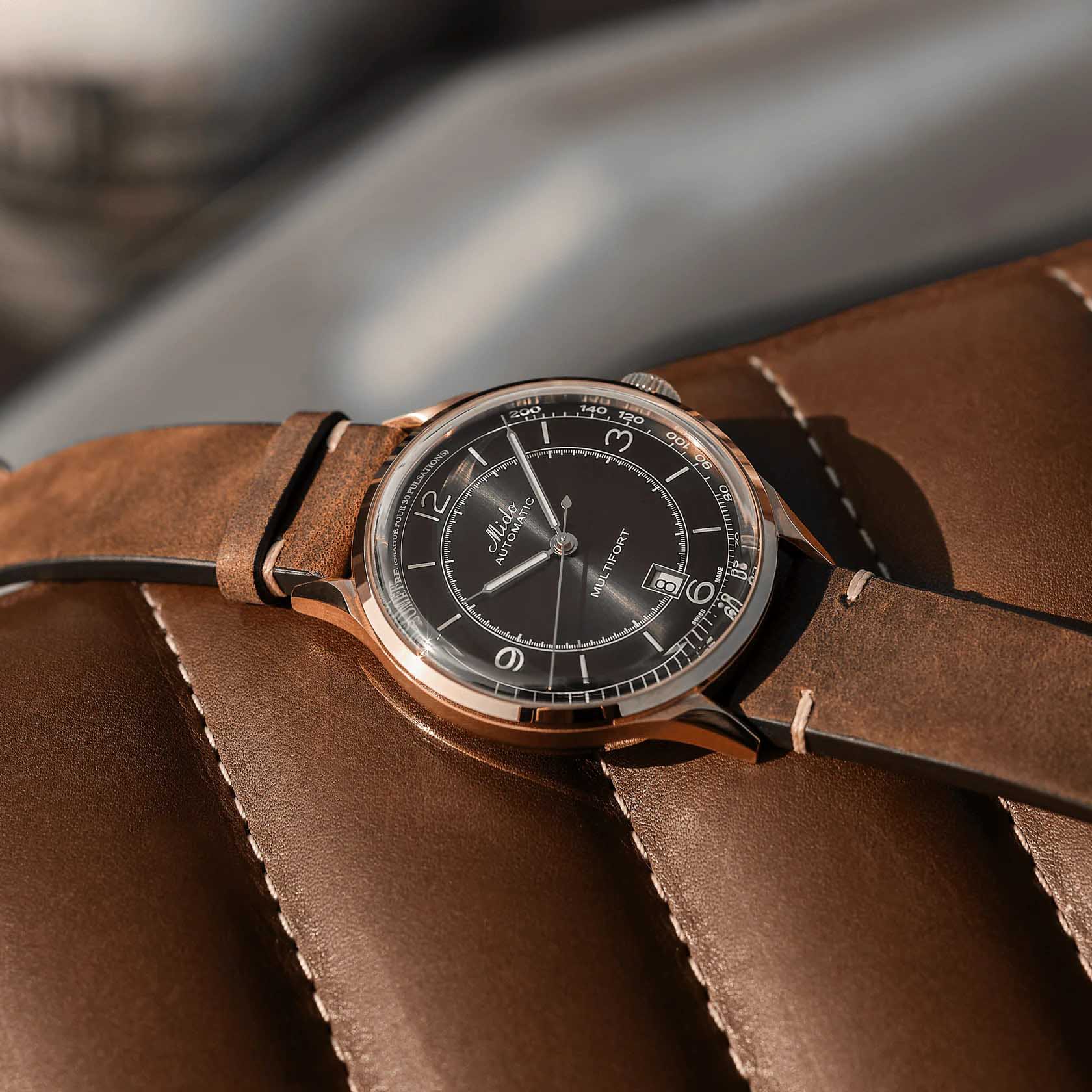 Часы MIDO Multifort Patrimony (артикул M040.407.36.060.00) сочетают элегантный ретро-дизайн и современные технологии, вдохновлённые историческими моделями MIDO. Корпус диаметром 40 мм выполнен из нержавеющей стали с PVD-покрытиемPVDУльтратонкое покрытие наносится в технике вакуумного напыления, сочетает в себе нитрид титана особой прочности со слоем золота или оксида хрома. Несёт в себе декоративную или защитную функцию. цвета розового золота и водозащитой до 5 бар (50 метров). Прозрачная задняя крышка подчёркивает изысканный механизм. Антрацитовый циферблат с градиентным эффектом оснащён накладными часовыми метками и арабскими цифрами с покрытием Super-LumiNova®Люминесцентное покрытиеПозволяет считывать показания времени в темноте. Производители наносят на стрелки, часовые индексы, безель или поверхность циферблата светонакопительный состав, дающий холодное свечение.. Шкала пульсометра добавляет уникальный элемент дизайна, а окошко даты расположено в положении «6 часов». Циферблат защищён сапфировым стекломСапфировое стеклоПрочный и надёжный материал из кристалла сапфира синтетического происхождения, характеризующийся особой твёрдостью и устойчивостью к царапинам и повреждениям. с антибликовым покрытием.