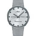 Циферблат с фирменным логотипом Mido 1950-х годов украшен накладными индексами и стрелками с люминесцентным покрытиемЛюминесцентное покрытиеПозволяет считывать показания времени в темноте. Производители наносят на стрелки, часовые индексы, безель или поверхность циферблата светонакопительный состав, дающий холодное свечение., обеспечивающим читаемость даже в условиях слабого освещения. На «3 часах» расположено двойное окошко календаря — день недели и дата. Стальной браслет миланского плетения на раскладном замкеРаскладной замокДанный вариант застежки используется только на часах с металлическим браслетом. Отличительная особенность такого крепления в том, что длина браслета становится универсальной и вы можете самостоятельно отрегулировать нужный вам размер – застежка просто двигается по браслету часов..Модель защищена акриловым стеклом, сохраняющим аутентичный винтажный характер. Прозрачная задняя крышка открывает вид на автоматический механизм с автоподзаводом и 80-часовым запасом хода.