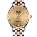 Mido Baroncelli M8600.4.26.1 — элегантная модель, сочетающая классику и современную швейцарскую инженерию. Корпус диаметром 38 мм изготовлен из нержавеющей стали и дополнен браслетом с PVD-покрытиемPVDУльтратонкое покрытие наносится в технике вакуумного напыления, сочетает в себе нитрид титана особой прочности со слоем золота или оксида хрома. Несёт в себе декоративную или защитную функцию. в пять рядов, снабжённым раскладной застёжкойРаскладная застёжкаТакой тип застёжки используется только на браслетах из металла. Она никогда не раскрывается полностью, происходит разделение на 2 и более частей. Раскладывающая застёжка снизит вероятность потери часов к минимуму. для удобства и надежности фиксации. БезельБезельВнешний ободок, закрепляющий стекло. В спортивных часах так называется поворотное кольцо с делениями на циферблате, выполняет роль таймера – замеряет отрезки времени на шкале. Неподвижный безель – элемент декора. Однонаправленно вращающийся безель на дайверских часах позволяет фиксировать моменты погружения и выныривания на поверхность. с PVD-покрытиемPVDУльтратонкое покрытие наносится в технике вакуумного напыления, сочетает в себе нитрид титана особой прочности со слоем золота или оксида хрома. Несёт в себе декоративную или защитную функцию.. Циферблат декорирован двенадцатью бриллиантами в качестве часовых меток, что придаёт часам утончённость и ювелирный блеск.
