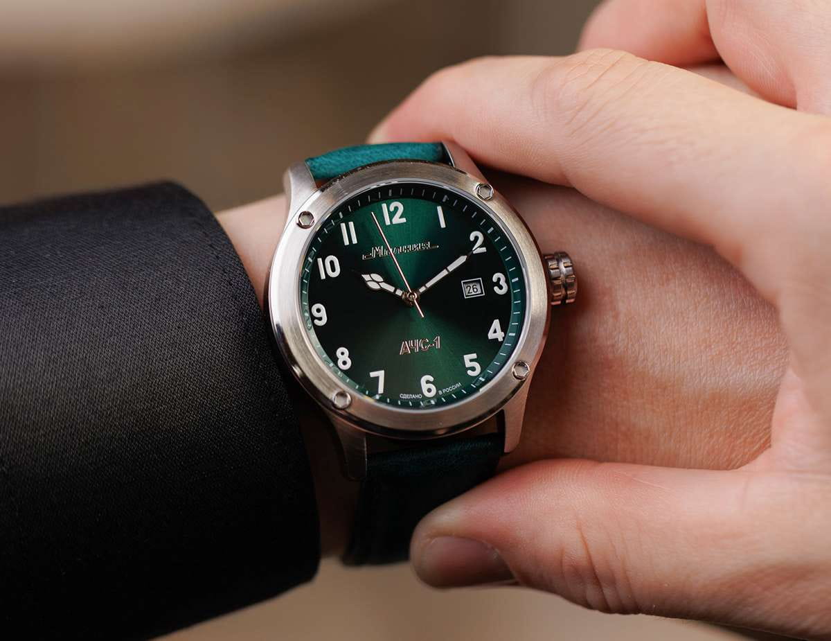Мужские механические часы с автоподзаводом — это надёжный аксессуар от легендарного бренда «МОЛНИЯ», созданного на Челябинском часовом заводе. Корпус диаметром 44 мм и высотой 12 мм выполнен из нержавеющей стали 316L с матовой полировкой. БезельБезельВнешний ободок, закрепляющий стекло. В спортивных часах так называется поворотное кольцо с делениями на циферблате, выполняет роль таймера – замеряет отрезки времени на шкале. Неподвижный безель – элемент декора. Однонаправленно вращающийся безель на дайверских часах позволяет фиксировать моменты погружения и выныривания на поверхность. также выполнен из стали с матовой отделкой. Циферблат зелёного цвета матовый, оформлен стрелками и индексами с люминесцентным покрытиемЛюминесцентное покрытиеПозволяет считывать показания времени в темноте. Производители наносят на стрелки, часовые индексы, безель или поверхность циферблата светонакопительный состав, дающий холодное свечение. Super-LumiNova. Окошко даты расположено в положении 3 часов. Циферблат защищён сапфировым стекломСапфировое стеклоПрочный и надёжный материал из кристалла сапфира синтетического происхождения, характеризующийся особой твёрдостью и устойчивостью к царапинам и повреждениям. толщиной 1,5 мм. Механизм — японский автоматический калибр Miyota 8215 с функцией и запасом хода 42 часа. Часы оснащены кожаным ремешком зелёного цвета шириной 22 мм с классической пряжкой. Водонепроницаемость 100 м позволяет использовать часы для плавания и повседневного ношения. Идеальный выбор для тех, кто ценит российское качество и мужественный дизайн.