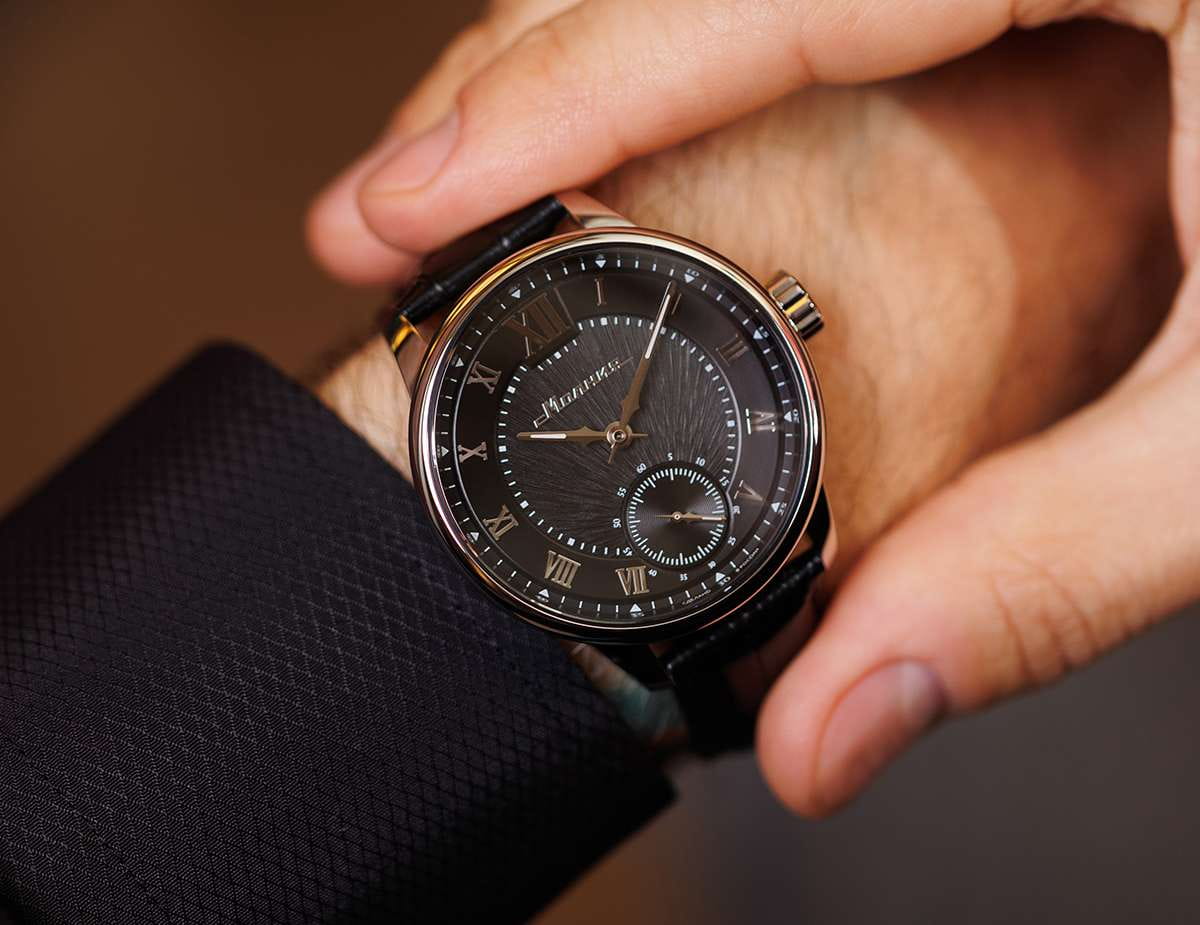 Мужские механические часы с ручным подзаводом — это аксессуар от легендарного бренда «МОЛНИЯ», созданный на Челябинском часовом заводе. Корпус диаметром 41 мм и толщиной 12 мм выполнен из нержавеющей стали 316L с зеркальной полировкой. БезельБезельВнешний ободок, закрепляющий стекло. В спортивных часах так называется поворотное кольцо с делениями на циферблате, выполняет роль таймера – замеряет отрезки времени на шкале. Неподвижный безель – элемент декора. Однонаправленно вращающийся безель на дайверских часах позволяет фиксировать моменты погружения и выныривания на поверхность. также выполнен из стали с зеркальной отделкой. Циферблат чёрного цвета оформлен римскими цифрами и стальными индексами. Малая секундная стрелка вынесена на позицию 6 часов. Циферблат защищён сапфировым стекломСапфировое стеклоПрочный и надёжный материал из кристалла сапфира синтетического происхождения, характеризующийся особой твёрдостью и устойчивостью к царапинам и повреждениям. толщиной 2,5 мм. Механизм — мануфактурный калибр 3603, собранный вручную, с запасом хода до 40 часов. Прозрачная задняя крышка позволяет наблюдать за работой механизма. Часы оснащены чёрным кожаным ремешком шириной 20 мм с раскладной застёжкойРаскладная застёжкаТакой тип застёжки используется только на браслетах из металла. Она никогда не раскрывается полностью, происходит разделение на 2 и более частей. Раскладывающая застёжка снизит вероятность потери часов к минимуму. и системой быстрой замены. Водонепроницаемость 100 м позволяет использовать часы для плавания и повседневного ношения. Идеальный выбор для тех, кто ценит российское качество и традиции.