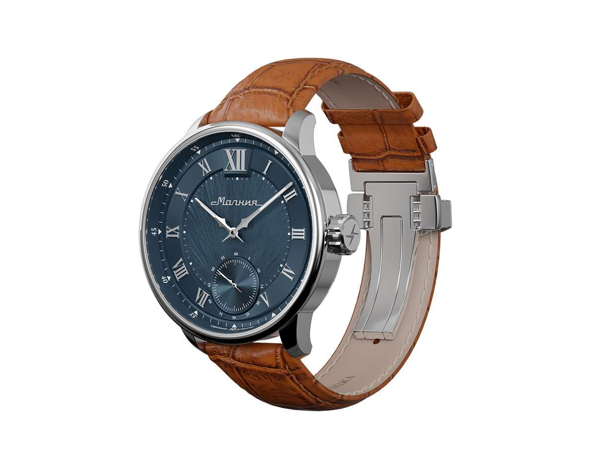 Мужские механические часы с ручным подзаводом — это аксессуар от легендарного бренда «МОЛНИЯ», созданный на Челябинском часовом заводе. Корпус диаметром 41 мм и толщиной 12 мм выполнен из нержавеющей стали 316L с зеркальной полировкой. БезельБезельВнешний ободок, закрепляющий стекло. В спортивных часах так называется поворотное кольцо с делениями на циферблате, выполняет роль таймера – замеряет отрезки времени на шкале. Неподвижный безель – элемент декора. Однонаправленно вращающийся безель на дайверских часах позволяет фиксировать моменты погружения и выныривания на поверхность. также выполнен из стали с зеркальной отделкой. Циферблат синего цвета оформлен римскими цифрами и стальными индексами. Малая секундная стрелка вынесена на позицию 6 часов. Циферблат защищён сапфировым стекломСапфировое стеклоПрочный и надёжный материал из кристалла сапфира синтетического происхождения, характеризующийся особой твёрдостью и устойчивостью к царапинам и повреждениям. толщиной 2,5 мм. Механизм — мануфактурный калибр 3603, собранный вручную, с запасом хода до 40 часов. Прозрачная задняя крышка позволяет наблюдать за работой механизма. Часы оснащены светло-коричневым кожаным ремешком шириной 20 мм с раскладной застёжкойРаскладная застёжкаТакой тип застёжки используется только на браслетах из металла. Она никогда не раскрывается полностью, происходит разделение на 2 и более частей. Раскладывающая застёжка снизит вероятность потери часов к минимуму. и системой быстрой замены. Водонепроницаемость 100 м позволяет использовать часы для плавания и повседневного ношения. Идеальный выбор для тех, кто ценит российское качество и традиции.
