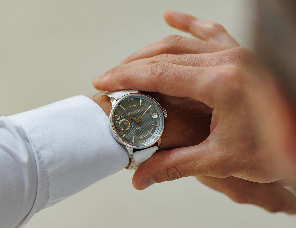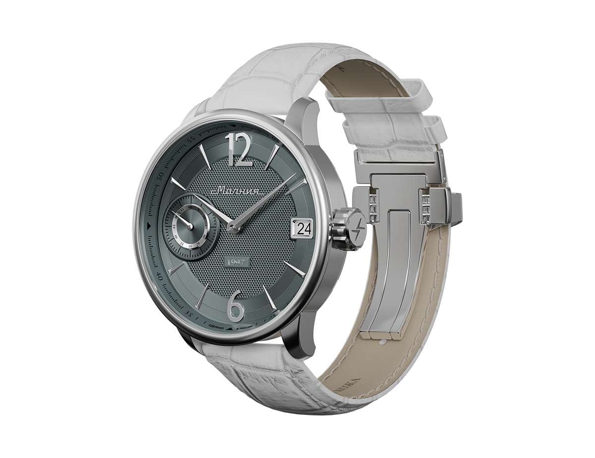 Мужские механические часы с ручным подзаводом — это аксессуар от легендарного бренда «МОЛНИЯ», созданный на Челябинском часовом заводе. Корпус диаметром 41 мм выполнен из нержавеющей стали 316L с зеркальной полировкой. Циферблат серого цвета оформлен арабскими цифрами и стальными индексами. Малая секундная стрелка вынесена на позицию 9 часов, окошко даты расположено в положении 3 часов. Циферблат защищён сапфировым стекломСапфировое стеклоПрочный и надёжный материал из кристалла сапфира синтетического происхождения, характеризующийся особой твёрдостью и устойчивостью к царапинам и повреждениям.. Механизм — мануфактурный калибр 3605, собранный вручную, с запасом хода до 40 часов. Прозрачная задняя крышка позволяет наблюдать за работой механизма. Часы оснащены кожаным ремешком белого цвета с раскладной застёжкойРаскладная застёжкаТакой тип застёжки используется только на браслетах из металла. Она никогда не раскрывается полностью, происходит разделение на 2 и более частей. Раскладывающая застёжка снизит вероятность потери часов к минимуму. и системой быстрой замены. Водонепроницаемость 100 м позволяет использовать часы для плавания и повседневного ношения. Идеальный выбор для тех, кто ценит российское качество и традиции.