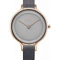 Женские кварцевые часы с точным японским механизмом. Минималистичный дизайн. Светло-серый циферблат. Центральные часовая и минутная стрелки. Круглый корпус выполнен из нержавеющей стали с IP покрытием цвета розового золота. Диаметр корпуса составляет 34 мм, толщина 7 мм. Стальной браслет миланского плетения с IP покрытием серого цвета. Застежка - раскладной замок. Минеральное стекло устойчиво к мелким механическим повреждениям. Водостойкость WR 30 (брызги).