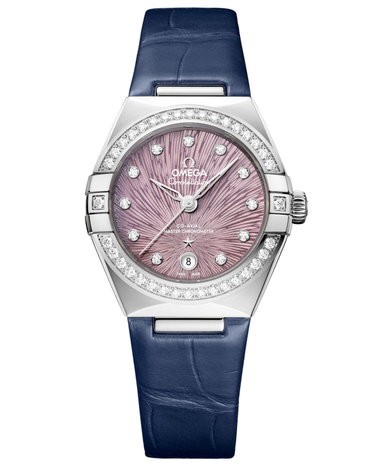 Легендарные высокоточные часы OMEGA Constellation, вдохновленные загадочным мерцанием звезд в ночном небе, заключены в корпус узнаваемой формы с полукруглыми скосами и полированными скобами по бокам. Модель диаметром 29 мм выполнена из нержавеющей стали и оснащена сияющим безелемБезельВнешний ободок, закрепляющий стекло. В спортивных часах так называется поворотное кольцо с делениями на циферблате, выполняет роль таймера – замеряет отрезки времени на шкале. Неподвижный безель – элемент декора. Однонаправленно вращающийся безель на дайверских часах позволяет фиксировать моменты погружения и выныривания на поверхность. с бриллиантовым паве. Циферблат сиреневого цвета с PVDPVDУльтратонкое покрытие наносится в технике вакуумного напыления, сочетает в себе нитрид титана особой прочности со слоем золота или оксида хрома. Несёт в себе декоративную или защитную функцию.-покрытием и фирменным узором Supernova, нанесенным методом электрохимического травления, дополнен окошком даты в положении «6 часов», стрелками и звездой из 18-каратного белого золота18-каратное золотоОбозначение по каратной системе пробирования, оно показывает, сколько драгоценного металла содержится в изделии. 18 карат - в составе 75% чистого золота, соответствует 750 пробе.