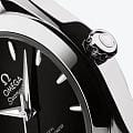Часы Omega Seamaster Aqua Terra выполнены в симметричном корпусе из нержавеющей стали с завинчивающейся задней крышкой, украшенной волновым узором. Циферблат чёрного цвета дополнен окошком даты на 6 часах и 11 индексами в форме корпусов парусников. Стрелки переработанной формы выполнены из 18K белого золота и оснащены люминесцентным покрытиемЛюминесцентное покрытиеПозволяет считывать показания времени в темноте. Производители наносят на стрелки, часовые индексы, безель или поверхность циферблата светонакопительный состав, дающий холодное свечение. Super-LumiNova для лучшей читаемости в темноте. Калибр Omega 8750 сертифицирован как Master Chronometer — гарантия высочайшей точности и устойчивости к магнитным полям. Запас хода составляет 48 часов. Защиту циферблата обеспечивает сапфировое стеклоСапфировое стеклоПрочный и надёжный материал из кристалла сапфира синтетического происхождения, характеризующийся особой твёрдостью и устойчивостью к царапинам и повреждениям. с антибликовым покрытиемАнтибликовое покрытиеСлой оксида металла в 0,13-0,3 микрон, благодаря которому стекло часов не бликует и не отражает свет. Антибликовое покрытие уменьшает отражение света в 10 раз, обеспечивая отличную читаемость показателей циферблата. с обеих сторон. Водозащита позволяет использовать часы в воде без риска повреждения. Диаметр корпуса — 30 мм, между "ушками" — 14 мм, толщина — 10.6 мм, общая длина между "ушками" — 36.5 мм. Часы установлены на интегрированный стальной браслет с закруглёнными звеньями и застёжкой-бабочкой с кнопкамиЗастёжка "бабочка"Такой вид застёжки дополняется предохранителями, помогающими избежать случайного раскрытия браслета. Обладают изящным исполнением. , обеспечивающим комфорт при ношении. Вес модели — около 81 грамма. Это сочетание премиального качества, технологичности и классического дизайна.