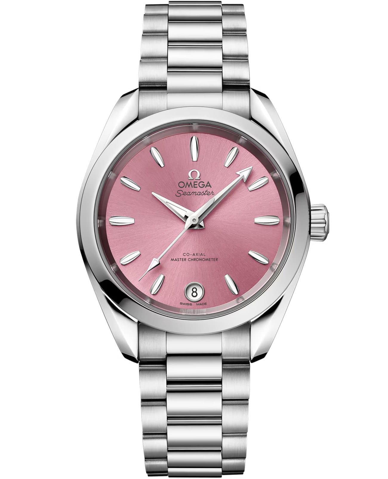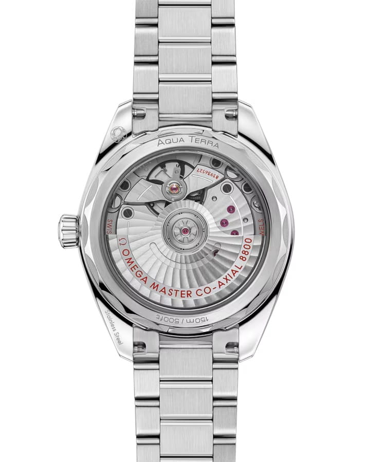 Omega Seamaster Aqua Terra выполнены в симметричном корпусе из полированной нержавеющей стали с завинчивающейся задней крышкой, украшенной волновым узором. Циферблат изготовлен из латуни и обработан методом солнечной шлифовки от центра к краям. Циферблат дополнен окошком даты на 6 часах, стрелками и метками из 18K белого золота с алмазной полировкой для высокой контрастности и читаемости. Логотип OMEGA также выполнен в этом же материале. Калибр Omega 8800 сертифицирован как Master Chronometer — гарантия высочайшей точности и устойчивости к магнитным полям. Запас хода составляет 55 часов. Защиту циферблата обеспечивает сапфировое стеклоСапфировое стеклоПрочный и надёжный материал из кристалла сапфира синтетического происхождения, характеризующийся особой твёрдостью и устойчивостью к царапинам и повреждениям. с антибликовым покрытиемАнтибликовое покрытиеСлой оксида металла в 0,13-0,3 микрон, благодаря которому стекло часов не бликует и не отражает свет. Антибликовое покрытие уменьшает отражение света в 10 раз, обеспечивая отличную читаемость показателей циферблата. с обеих сторон. Водозащита позволяет использовать часы в воде без риска повреждения. Часы установлены на браслет со скруглёнными звеньями и раскладной застёжкойРаскладная застёжкаТакой тип застёжки используется только на браслетах из металла. Она никогда не раскрывается полностью, происходит разделение на 2 и более частей. Раскладывающая застёжка снизит вероятность потери часов к минимуму.. Это сочетание премиального качества, технологичности и классического дизайна.