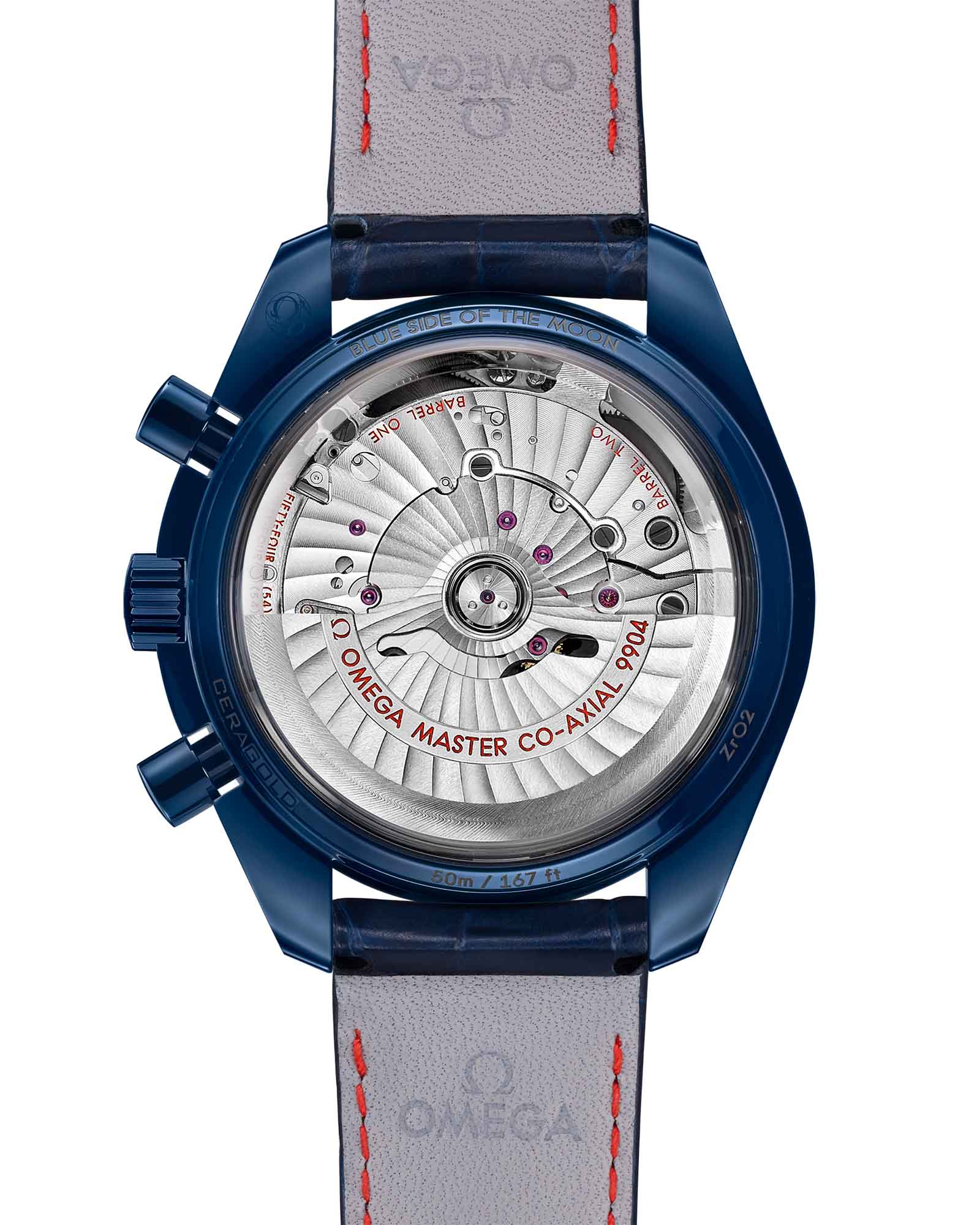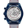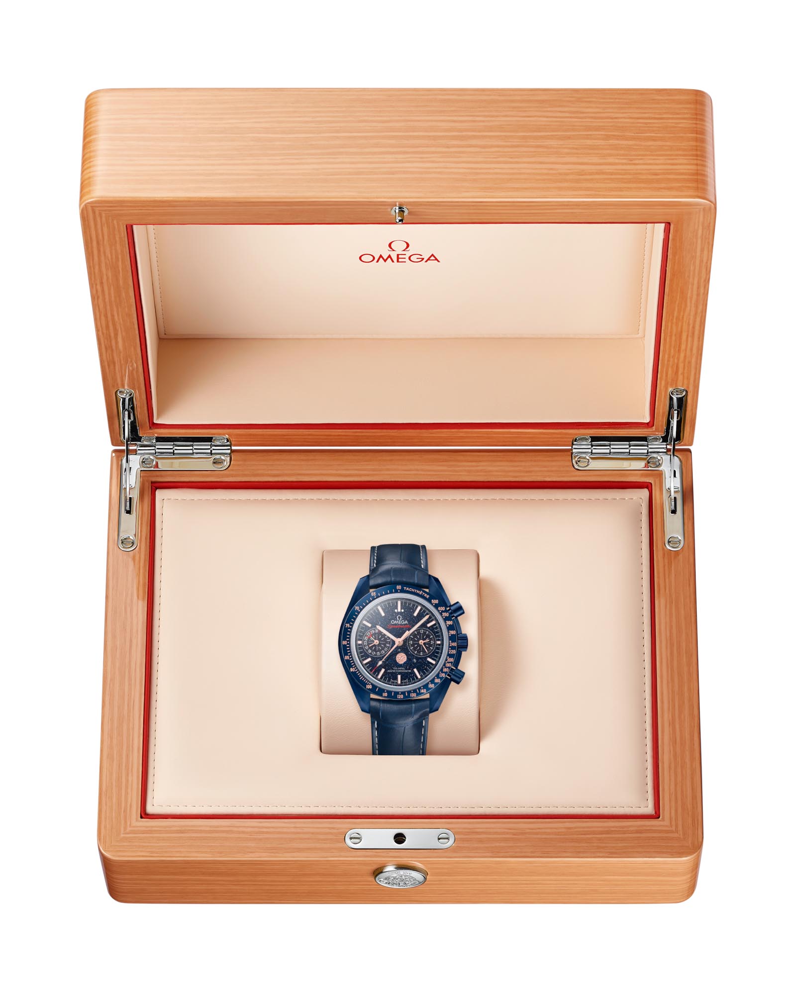 Speedmaster Blue Side of the Moon — дань уважения шести легендарным лунным миссиям, вдохновленная таинственным синим сиянием космоса. 44,25-мм корпус из высокотехнологичной керамики глубокого синего цвета с керамическим безелемБезельВнешний ободок, закрепляющий стекло. В спортивных часах так называется поворотное кольцо с делениями на циферблате, выполняет роль таймера – замеряет отрезки времени на шкале. Неподвижный безель – элемент декора. Однонаправленно вращающийся безель на дайверских часах позволяет фиксировать моменты погружения и выныривания на поверхность., украшенным тахиметрической шкалойТахиметрРазмеченная шкала, располагается на ободке или безеле часов. Тахиметр позволяет рассчитать скорость на определённом участке пути, расстояние измеряется в километрах или милях. из OMEGA Ceragold™, сочетается с синим кожаным ремешком и раскладывающейся застежкой из титана с керамической отделкой. Циферблат из мерцающего авантюринового стекла демонстрирует индексы и стрелки из золота Sedna™18-каратное золотоОбозначение по каратной системе пробирования, оно показывает, сколько драгоценного металла содержится в изделии. 18 карат - в составе 75% чистого золота, соответствует 750 пробе.