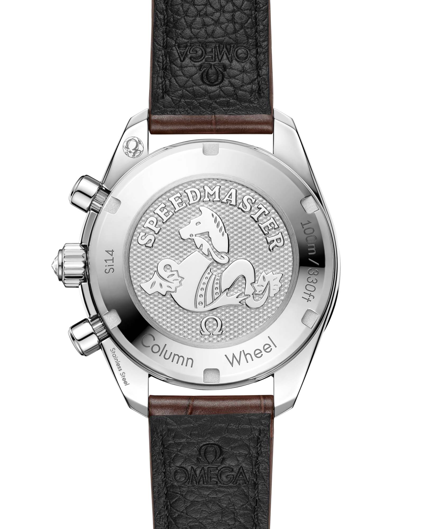 Speedmaster 38 мм — утончённая версия легендарного хронографа OMEGA, сочетающая классические черты с современной элегантностью. Полированный корпус из нержавеющей стали украшен безелемБезельВнешний ободок, закрепляющий стекло. В спортивных часах так называется поворотное кольцо с делениями на циферблате, выполняет роль таймера – замеряет отрезки времени на шкале. Неподвижный безель – элемент декора. Однонаправленно вращающийся безель на дайверских часах позволяет фиксировать моменты погружения и выныривания на поверхность. с 52 бриллиантами, а полированную заводную головку венчает ещё один сверкающий бриллиант. Коричневый циферблат с PVD-покрытиемPVDУльтратонкое покрытие наносится в технике вакуумного напыления, сочетает в себе нитрид титана особой прочности со слоем золота или оксида хрома. Несёт в себе декоративную или защитную функцию. эффектно дополнен горизонтальными овальными счётчиками с серебристой отделкой и вертикальным окошком даты на 6 часах. Часовые и минутные стрелки с родиевым покрытием и алмазной полировкой оснащены покрытием Super-LumiNovaЛюминесцентное покрытиеПозволяет считывать показания времени в темноте. Производители наносят на стрелки, часовые индексы, безель или поверхность циферблата светонакопительный состав, дающий холодное свечение., излучающим зелёное свечение. Часы дополнены коричневым кожаным ремешком с раскладывающейся застёжкойРаскладная застёжкаТакой тип застёжки используется только на браслетах из металла. Она никогда не раскрывается полностью, происходит разделение на 2 и более частей. Раскладывающая застёжка снизит вероятность потери часов к минимуму. из нержавеющей стали. На завинчивающейся задней крышке выгравирован фирменный медальон с морским коньком. В основе — высокоточный калибр OMEGA Co-Axial 3330, продолжающий традиции знаменитого хронографа.
