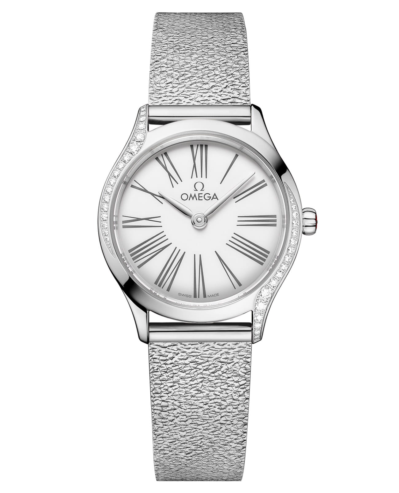 Mini Trésor — воплощение современной женственности OMEGA, где 26-мм корпус из нержавеющей стали играет бриллиантовыми волнами по бокам, а заводная головка с алмазом в обрамлении красной гибридной керамики добавляет дерзкий акцент. Куполообразный циферблат из белой эмали "Grand Feu" с сероватым оттенком и изящными римскими цифрами создает эффект парящей легкости. Плетеный браслет из стали с шелковистым рельефом и раскладывающейся застежкой подчеркивает утонченную прочность, а сапфировое стекло задней крышки с зеркальным эффектом и узором "Her Time" приоткрывает взгляду точный кварцевый механизм OMEGA 4061 — идеальный баланс хрупкости и надежности в миниатюрном шедевре.
