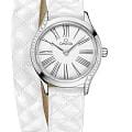 Mini Trésor — воплощение современной женственности в миниатюрном 26-мм корпусе из нержавеющей стали, где каждый миллиметр продуман до совершенства. Боковые поверхности украшены элегантными рядами бриллиантов, а заводная головка с алмазом обрамлена цветком из красной гибридной керамики, добавляя ноту игривого очарования. Куполообразный циферблат из белой эмали "Grand Feu" с сероватым оттенком и серыми римскими цифрами создает эффект воздушной легкости. Двойной ремешок из лакированной телячьей кожи с ромбовидным стеганым узором подчеркивает изысканность модели. Внутри бьется точный кварцевый механизм OMEGA 4061, скрытый за зеркальной задней крышкой с фирменным узором "Her Time" — истинное ювелирное произведение на запястье.