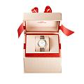 грациозно соседствуют с чередующимися римскими цифрами и бриллиантовыми метками. Лаконичный дизайн дополнен изящной минутной шкалой в виде точечных маркеров и задней крышкой с рельефным медальоном, изображающим бога времени Хроноса. Часы представлены с переливающимся кожаным ремешком серо-коричневого оттенка и оснащены кварцевым механизмом OMEGA 4061, гарантирующим точность хода на протяжении не менее 48 месяцев.