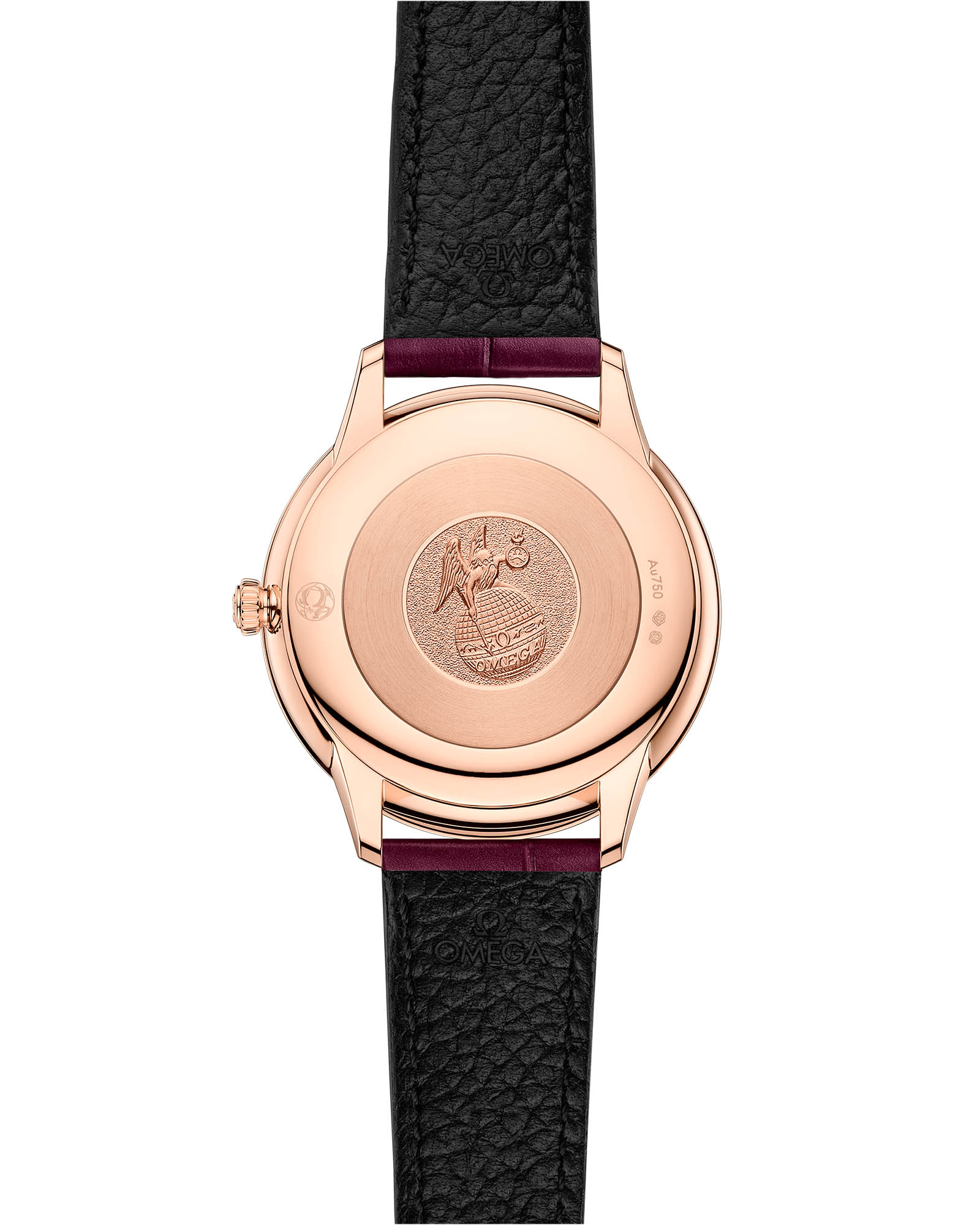 Sedna™. Лаконичный дизайн дополнен утонченной минутной шкалой в виде точек на внутреннем секторе и задней крышкой с рельефным медальоном, изображающим бога времени Хроноса. Модель представлена с переливающимся кожаным ремешком бордового цвета и оснащена кварцевым механизмом OMEGA 4061, гарантирующим бесперебойную работу не менее 48 месяцев.