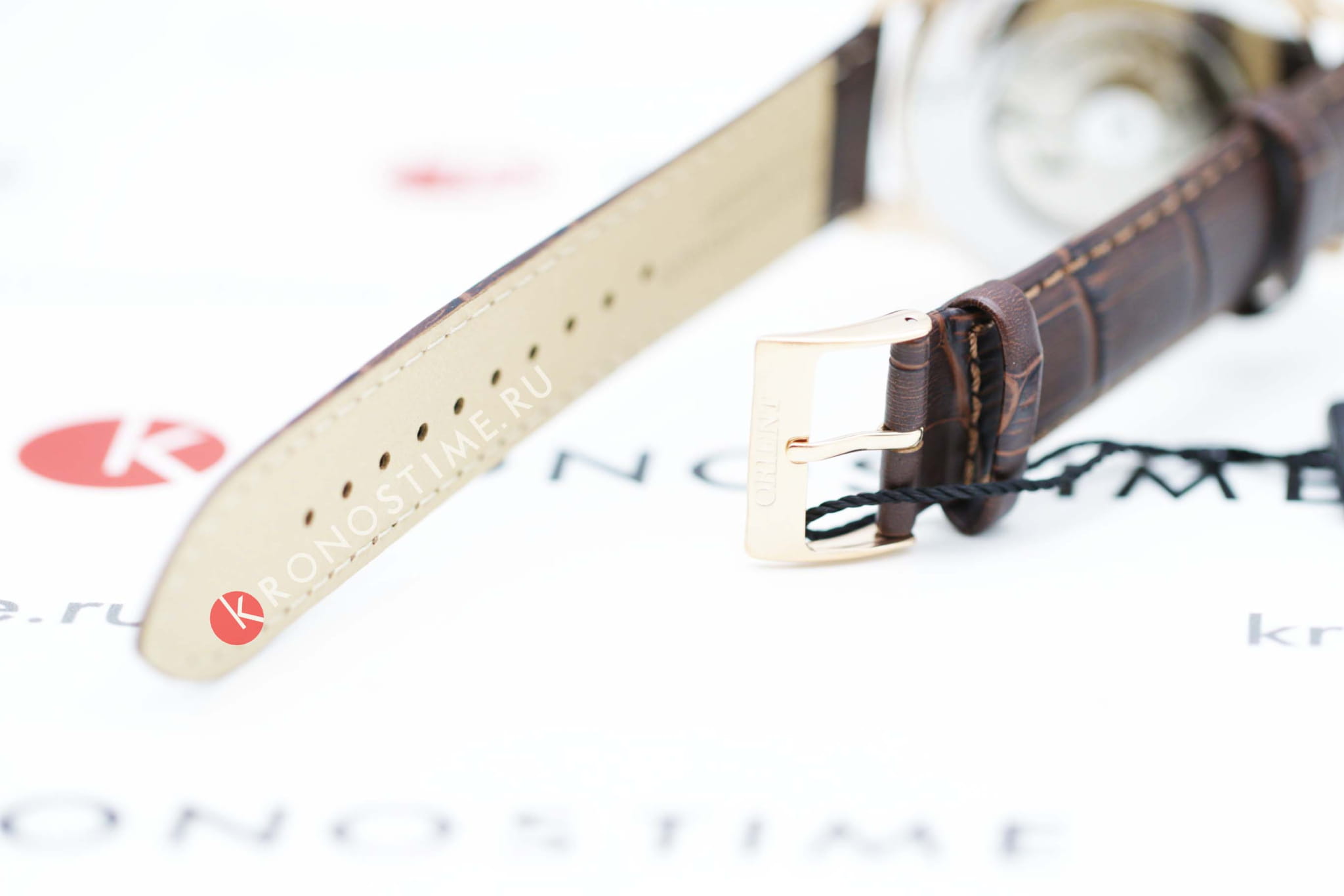 Orient Envoy Classic Open Heart AG00001T — это элегантные часы с утонченным классическим дизайном и надежным механизмом. Корпус диаметром 43 мм выполнен из нержавеющей стали с PVD-покрытиемPVDУльтратонкое покрытие наносится в технике вакуумного напыления, сочетает в себе нитрид титана особой прочности со слоем золота или оксида хрома. Несёт в себе декоративную или защитную функцию. розового цвета, что придаёт модели изысканный и стильный вид. Коричневый циферблат украшен римскими цифрами и тонкими стрелками, обеспечивающими отличную читаемость. Окошко "Open Heart" на отметке 9 часов позволяет наблюдать за работой механизма. Защитное минеральное стеклоМинеральное стеклоМинеральное стекло представляет собой искусственно выращенный минерал кварца. Такое стекло отличается особой устойчивостью к повреждениям и царапинам. Уступает по некоторым качествам сапфировому стеклу. с выпуклой формой добавляет часам винтажную эстетику. Внутри установлен автоматический механизм Orient калибра F6T22 с функцией ручного подзавода и стоп-секунды, обеспечивающий точность и запас хода до 40 часов. Модель укомплектована коричневым кожаным ремешком с тиснением под крокодила, а классическая застёжка обеспечивает комфортное и надежное ношение. Водонепроницаемость 50 метров защищает часы от брызг и кратковременного контакта с водой, делая их отличным выбором для повседневного использования.