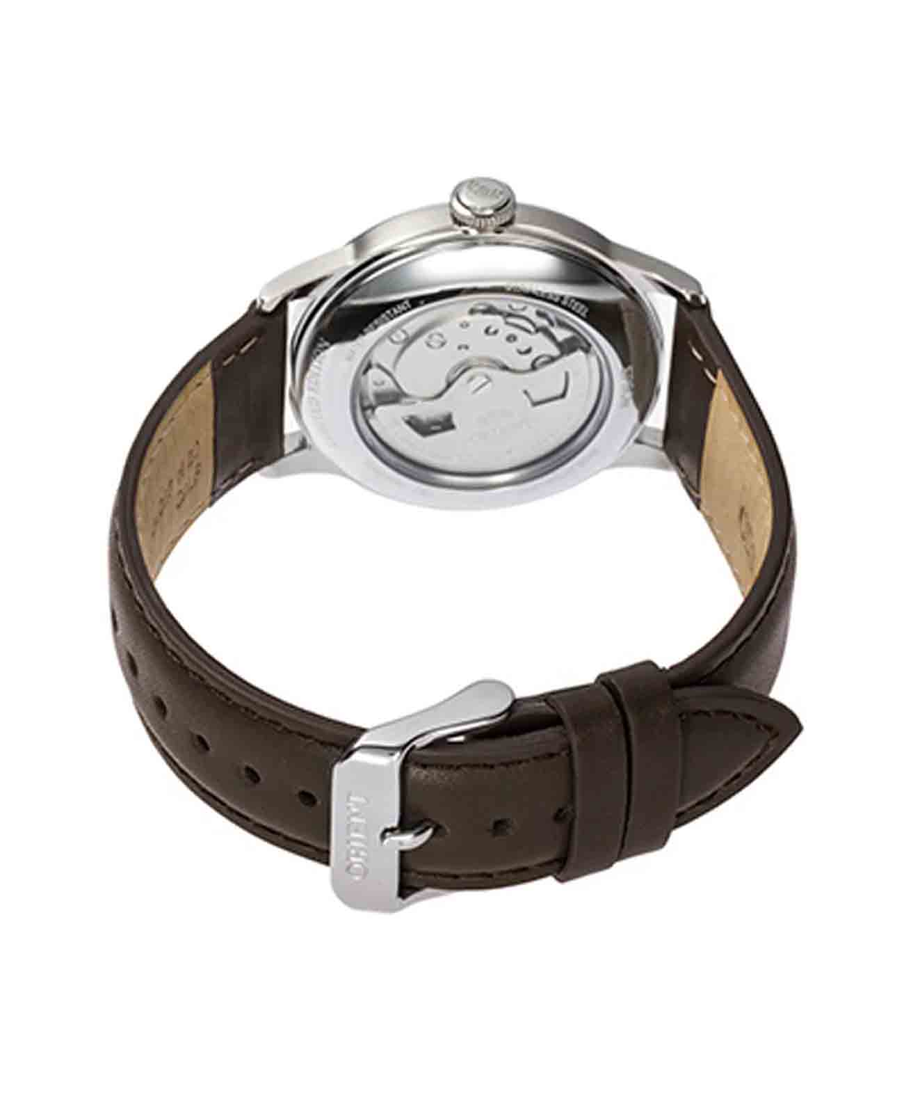 Отличительной особенностью этой модели является прозрачная задняя крышка, открывающая вид на внутренний механизм часов. Это не только добавляет часам визуального интереса, но и позволяет любоваться сложным устройством в действии. Циферблат часов украшен минималистичными часовыми индексами в виде штрихов, что создает ощущение легкости и простоты. В положении «3 часа» расположено окошко даты, которое предоставляет удобный доступ к информации о текущем дне.