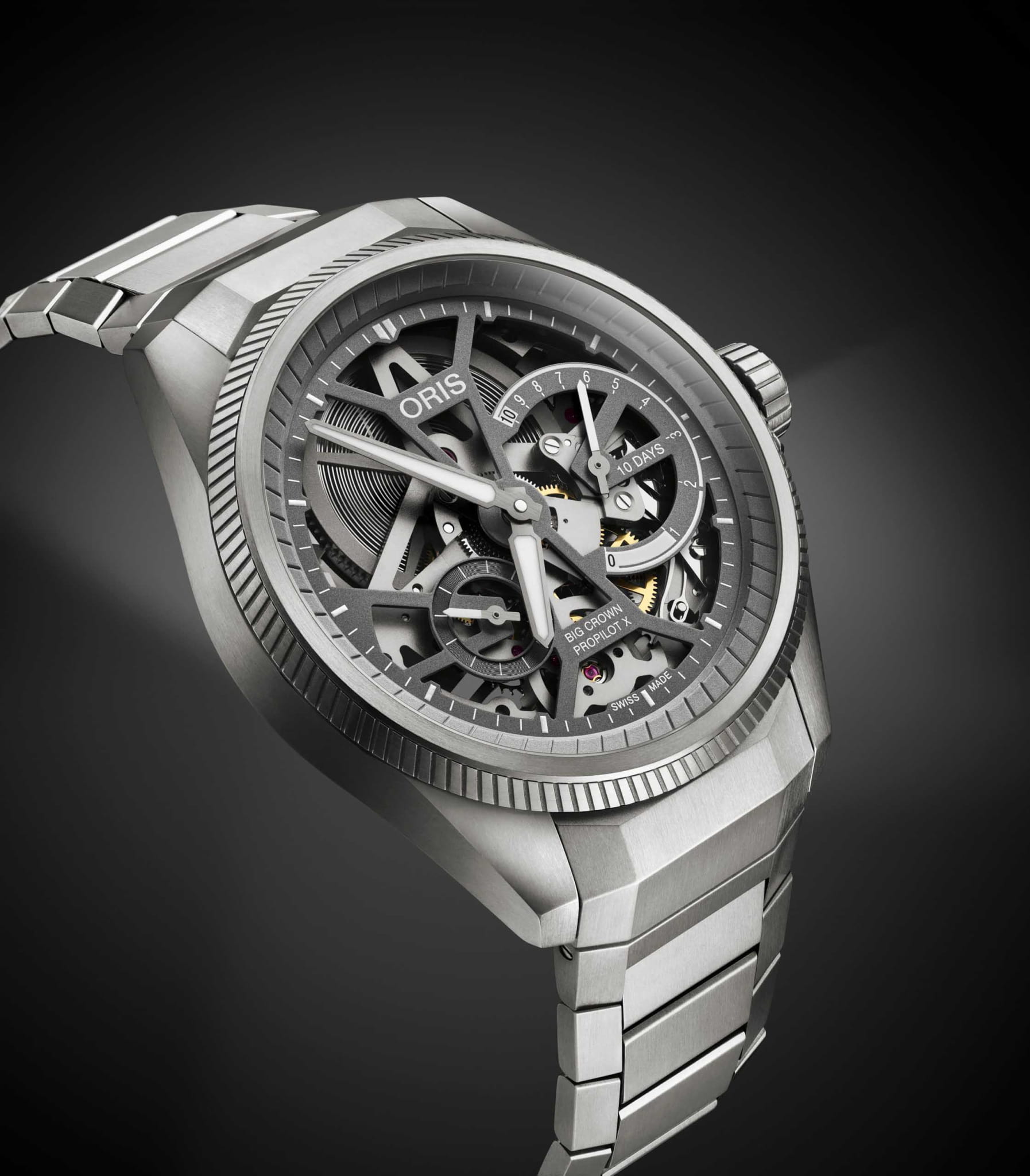 Откройте для себя ProPilot X Calibre 115, архитектурную красоту с титановым корпусом и браслетом, скелетонизированным циферблатом и 10-дневным запасом хода - характеристики, которые объединяет вечная радость независимого швейцарского механического часового дела. ProPilot X Calibre 115, шедевр современного часового искусства, в титановом корпусе 44 мм. В них установлен завораживающий Calibre 115 - скелетонизированная версия 10-дневного калибра с ручным заводом, нелинейным индикатором запаса хода и малой секундной стрелкой.
