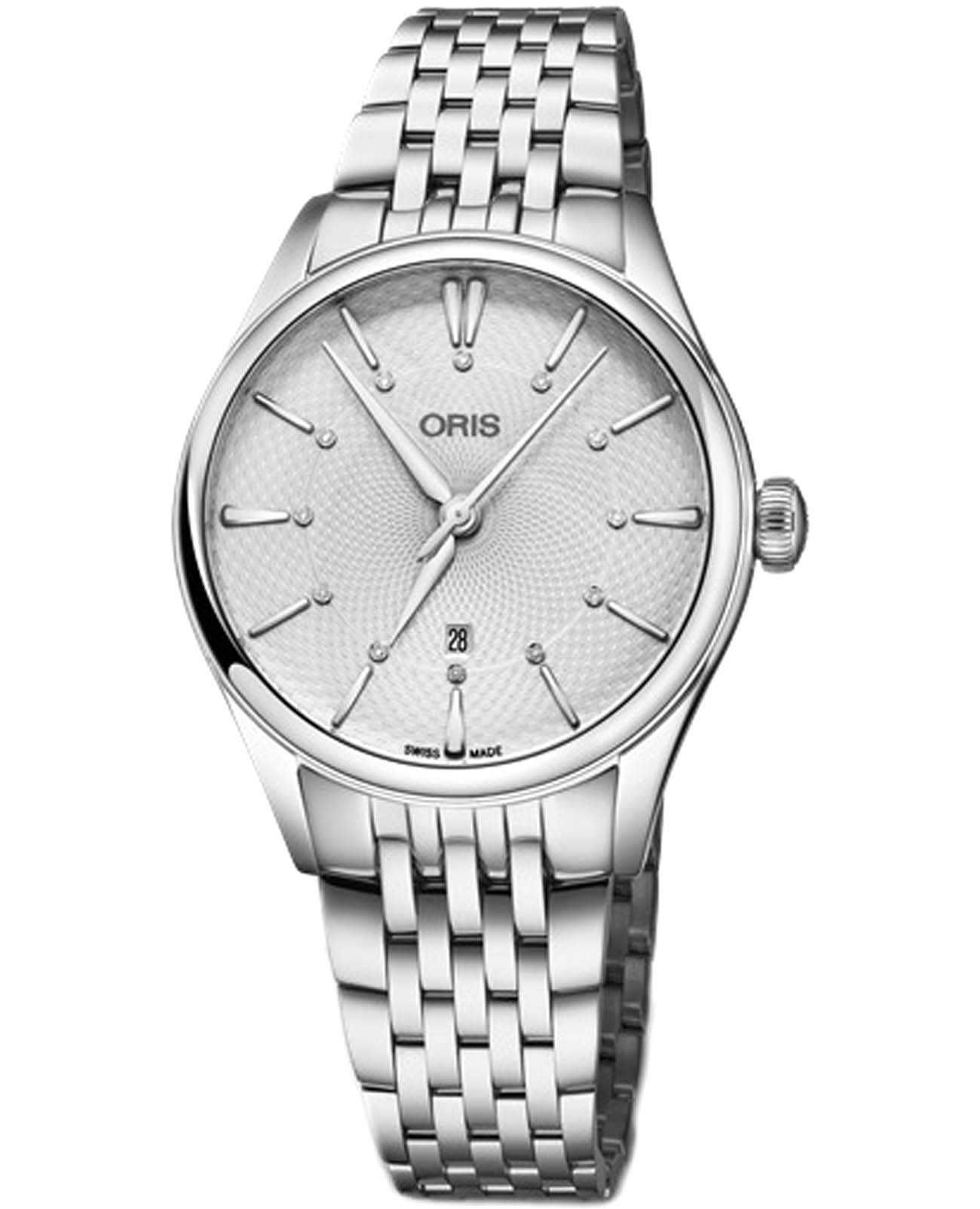 Oris 01 561 7724 4051-07 8 17 79 Artelier – это элегантные часы, сочетающие в себе классический дизайн и современную функциональность. Корпус из нержавеющей стали диаметром 33 мм идеально подходит для тех, кто ценит утонченность и стиль. Сапфировое стеклоСапфировое стеклоПрочный и надёжный материал из кристалла сапфира синтетического происхождения, характеризующийся особой твёрдостью и устойчивостью к царапинам и повреждениям. с антибликовым покрытием защищает циферблат от царапин и обеспечивает отличную читаемость при любом освещении. Стальной браслет на застёжке-бабочке с кнопкамиЗастёжка "бабочка"Такой вид застёжки дополняется предохранителями, помогающими избежать случайного раскрытия браслета. Обладают изящным исполнением. идеально дополняет дизайн часов, обеспечивая комфортное ношение. Часы оснащены центральной секундной стрелкой и окошком даты в положении «6 часов», что делает их функциональными для повседневного использования. Часы обладают водонепроницаемостью в 5 бар (50 метров). Каждая из этих функций прекрасно отображается на потрясающем циферблате, украшенном накладными индексами, гладкими стрелками из нержавеющей стали с бриллиантами, установленными в маркерах, и легендарным логотипом Oris.