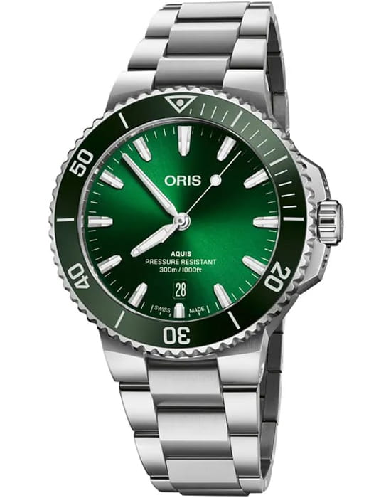 В зеленом цвете Aquis Date 41.50 превращается в природную картинку. Это повседневные люксовые часы со стандартами качества Swiss Made, надежностью автоматики и водонепроницаемостью до 30 АТМ (30 м).