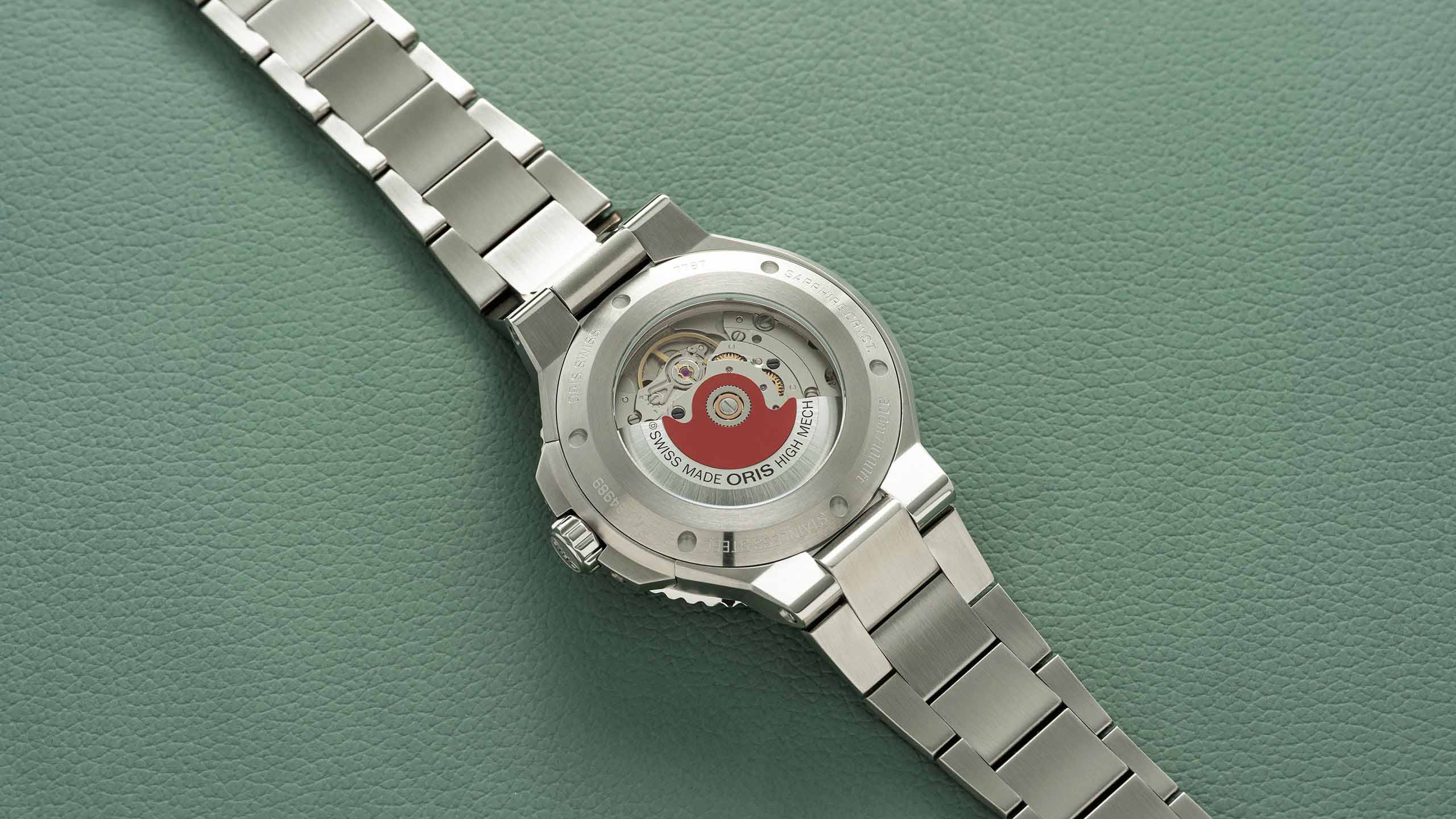 Многокомпонентный корпус из нержавеющей стали, керамический безельБезельВнешний ободок, закрепляющий стекло. В спортивных часах так называется поворотное кольцо с делениями на циферблате, выполняет роль таймера – замеряет отрезки времени на шкале. Неподвижный безель – элемент декора. Однонаправленно вращающийся безель на дайверских часах позволяет фиксировать моменты погружения и выныривания на поверхность. с минутной шкалой. Сапфировое стеклоСапфировое стеклоПрочный и надёжный материал из кристалла сапфира синтетического происхождения, характеризующийся особой твёрдостью и устойчивостью к царапинам и повреждениям., выпуклое с обеих сторон, внутреннее антибликовое покрытие. Прозрачная задняя крышка из сапфирового стеклаСапфировое стеклоПрочный и надёжный материал из кристалла сапфира синтетического происхождения, характеризующийся особой твёрдостью и устойчивостью к царапинам и повреждениям.. Стрелки и метки с люминесцентным покрытиемЛюминесцентное покрытиеПозволяет считывать показания времени в темноте. Производители наносят на стрелки, часовые индексы, безель или поверхность циферблата светонакопительный состав, дающий холодное свечение.. Завинчивающаяся заводная головка.