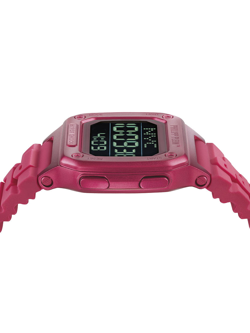 Электронные унисекс часы-хронографХронографФункция позволяет измерять отрезки времени с особой точностью: часы, минуты, секунды. Верным признаком хронографа является наличие на циферблате 3 дополнительных окошек-счётчиков. Philipp Plein Hyper Shock PWHAA0121, электронный механизм с высокой точностью. Класс водозащиты: 50 метров, позволит защитить корпус от случайных брызг или капель дождя. Прямоугольный корпус выполнен из нержавеющей стали с IP-покрытиемIP-покрытиеМетод ионного напыления. Демонстрирует повышенную устойчивость к истиранию, окислению и химическим веществам. Под воздействием высокого давления и температуры около 1500°C молекулы металла надёжно соединяются с частицами корпуса часов. розового цвета. Силиконовый ремешок шириной 22 мм, со стандартной застежкой.