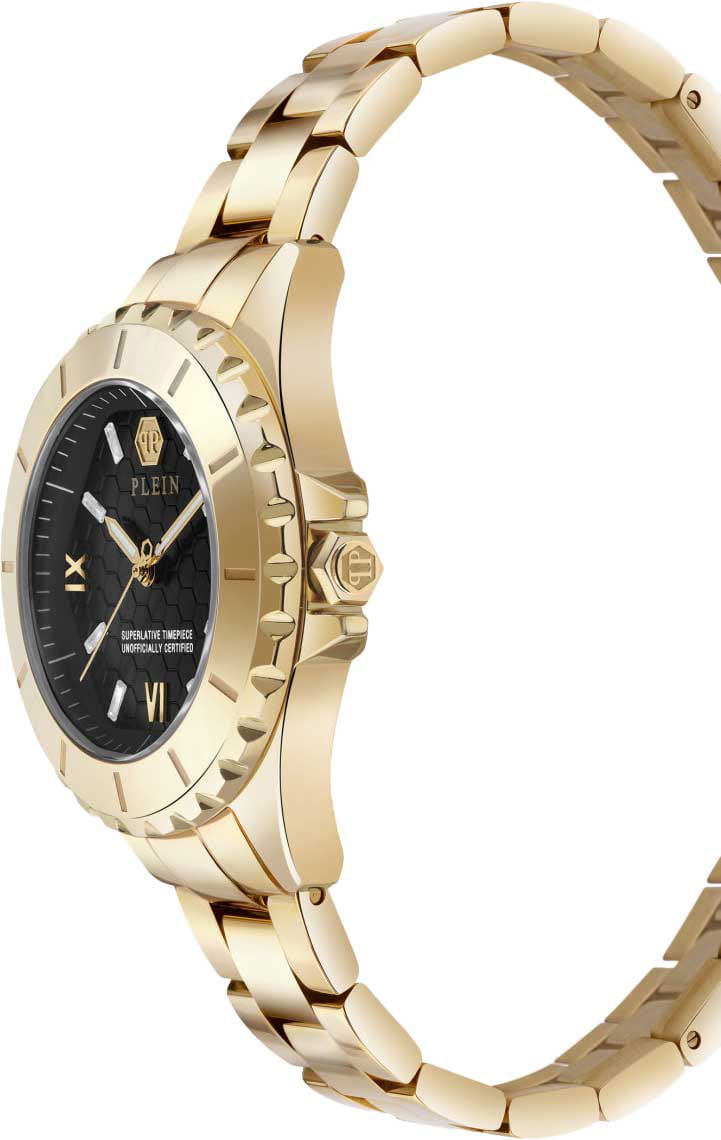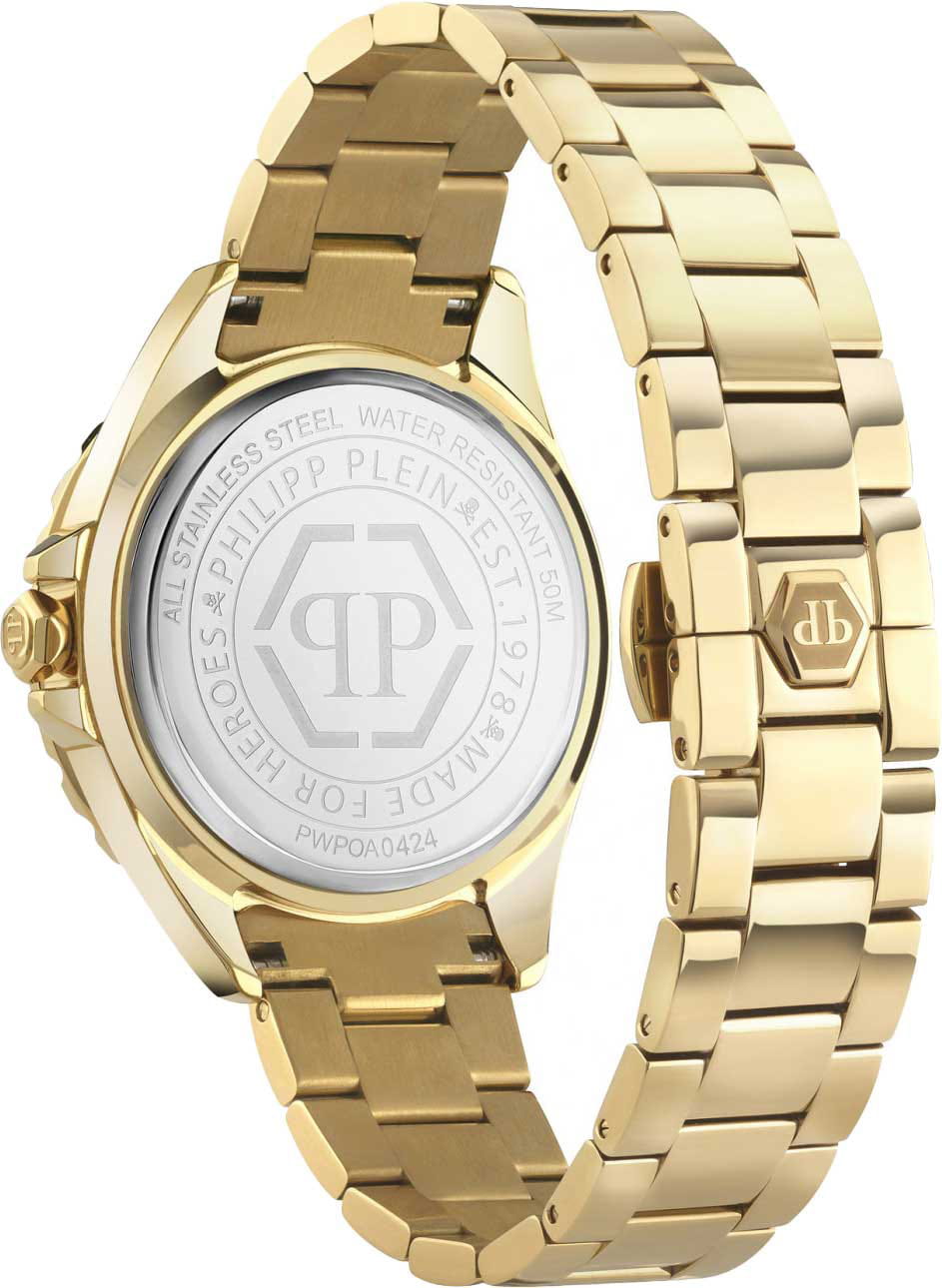 Женские часы Philipp Plein PWPOA0524 с надежным кварцевым механизмом. Корпус часов изготовлен из стали с IP-покрытиемIP-покрытиеМетод ионного напыления. Демонстрирует повышенную устойчивость к истиранию, окислению и химическим веществам. Под воздействием высокого давления и температуры около 1500°C молекулы металла надёжно соединяются с частицами корпуса часов.. Минеральное стеклоМинеральное стеклоМинеральное стекло представляет собой искусственно выращенный минерал кварца. Такое стекло отличается особой устойчивостью к повреждениям и царапинам. Уступает по некоторым качествам сапфировому стеклу. устойчивое к мелким механическим повреждениям. Влагозащита: 50 метров, позволит плавать, нырять и заниматься другими водными видами спорта. Стрелки и метки с люминесцентным покрытиемЛюминесцентное покрытиеПозволяет считывать показания времени в темноте. Производители наносят на стрелки, часовые индексы, безель или поверхность циферблата светонакопительный состав, дающий холодное свечение..