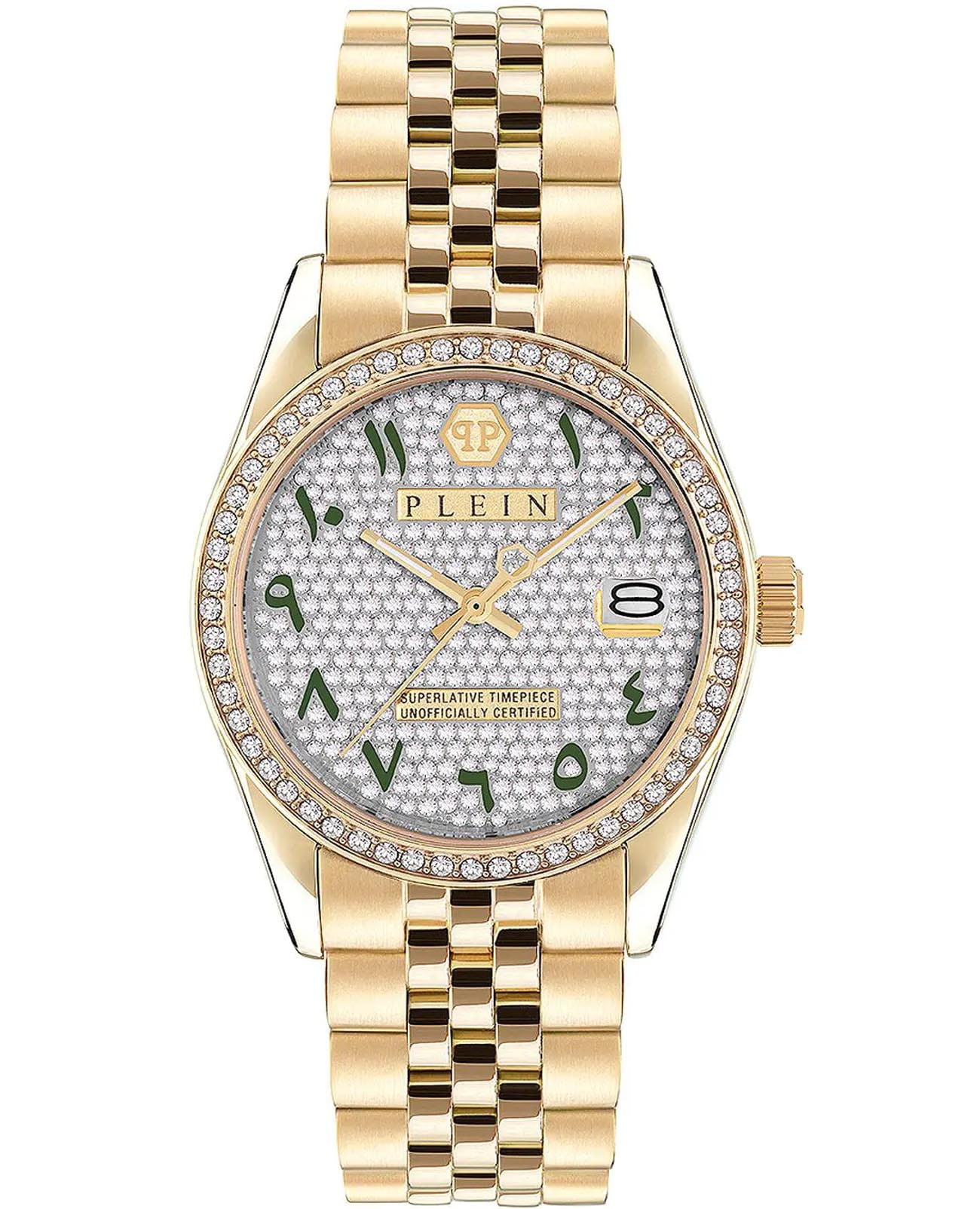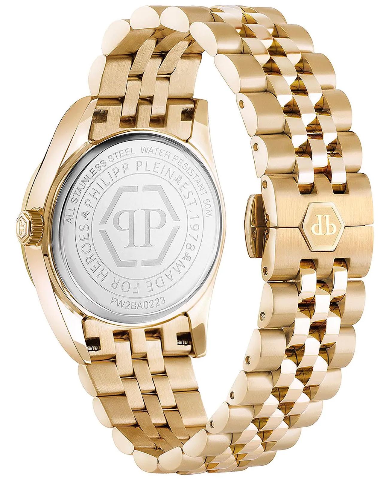 Стильные женские часы Philipp Plein Street Couture PW2BA0223 с надежным кварцевым механизмом. Корпус часов изготовлен из нержавеющей стали с IP-покрытиемIP-покрытиеМетод ионного напыления. Демонстрирует повышенную устойчивость к истиранию, окислению и химическим веществам. Под воздействием высокого давления и температуры около 1500°C молекулы металла надёжно соединяются с частицами корпуса часов.. Минеральное стеклоМинеральное стеклоМинеральное стекло представляет собой искусственно выращенный минерал кварца. Такое стекло отличается особой устойчивостью к повреждениям и царапинам. Уступает по некоторым качествам сапфировому стеклу. устойчивое к мелким механическим повреждениям. Влагозащита: 50 метров, позволит защитить корпус от случайных брызг или капель дождя. Стрелки с люминесцентным покрытиемЛюминесцентное покрытиеПозволяет считывать показания времени в темноте. Производители наносят на стрелки, часовые индексы, безель или поверхность циферблата светонакопительный состав, дающий холодное свечение.. Стальной браслет на застёжке-бабочке с кнопкамиЗастёжка "бабочка"Такой вид застёжки дополняется предохранителями, помогающими избежать случайного раскрытия браслета. Обладают изящным исполнением. . Циферблат и безельБезельВнешний ободок, закрепляющий стекло. В спортивных часах так называется поворотное кольцо с делениями на циферблате, выполняет роль таймера – замеряет отрезки времени на шкале. Неподвижный безель – элемент декора. Однонаправленно вращающийся безель на дайверских часах позволяет фиксировать моменты погружения и выныривания на поверхность. инкрустированы кристаллами Preciosa. Окошко даты находится в положении 3 часа.