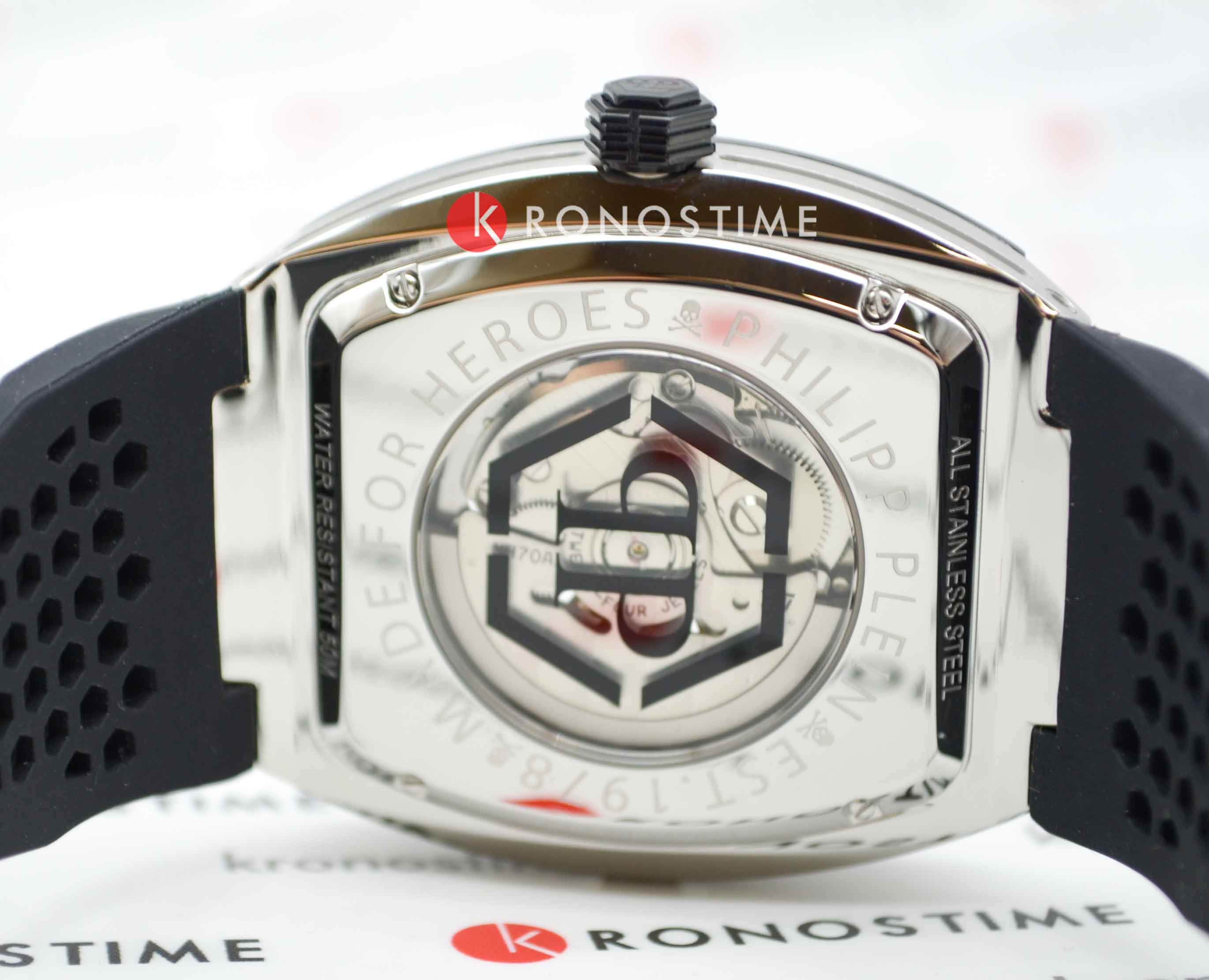 Мужские механические часы-скелетоны Philipp Plein The Skeleton PWBAA2023. Корпус часов изготовлен из нержавеющей стали. Минеральное стеклоМинеральное стеклоМинеральное стекло представляет собой искусственно выращенный минерал кварца. Такое стекло отличается особой устойчивостью к повреждениям и царапинам. Уступает по некоторым качествам сапфировому стеклу. устойчивое к мелким механическим повреждениям. Влагозащита: 50 метров, позволит защитить корпус от случайных брызг или капель дождя. Стрелки с люминесцентным покрытиемЛюминесцентное покрытиеПозволяет считывать показания времени в темноте. Производители наносят на стрелки, часовые индексы, безель или поверхность циферблата светонакопительный состав, дающий холодное свечение.. Практичный ремешок из силикона на стандартной застёжке.