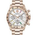 Яркие женские часы-хронографХронографФункция позволяет измерять отрезки времени с особой точностью: часы, минуты, секунды. Верным признаком хронографа является наличие на циферблате 3 дополнительных окошек-счётчиков. с секундомеромСекундомерСекундоме́р — прибор, способный измерять интервалы времени с точностью до долей секунды. Philipp Plein Nobile Lady PWSBA0323, кварцевый механизм с высокой точностью. 12 и 24-часовой формат времени. Класс водозащиты: 50 метров, позволит защитить корпус от случайных брызг или капель дождя. Корпус и браслет часов изготовлены из стали с IP-покрытиемIP-покрытиеМетод ионного напыления. Демонстрирует повышенную устойчивость к истиранию, окислению и химическим веществам. Под воздействием высокого давления и температуры около 1500°C молекулы металла надёжно соединяются с частицами корпуса часов.. Стрелки с люминесцентным покрытиемЛюминесцентное покрытиеПозволяет считывать показания времени в темноте. Производители наносят на стрелки, часовые индексы, безель или поверхность циферблата светонакопительный состав, дающий холодное свечение.. Стальной браслет на застёжке-бабочке с кнопкамиЗастёжка "бабочка"Такой вид застёжки дополняется предохранителями, помогающими избежать случайного раскрытия браслета. Обладают изящным исполнением. . Циферблат инкрустирован кристаллами Preciosa.